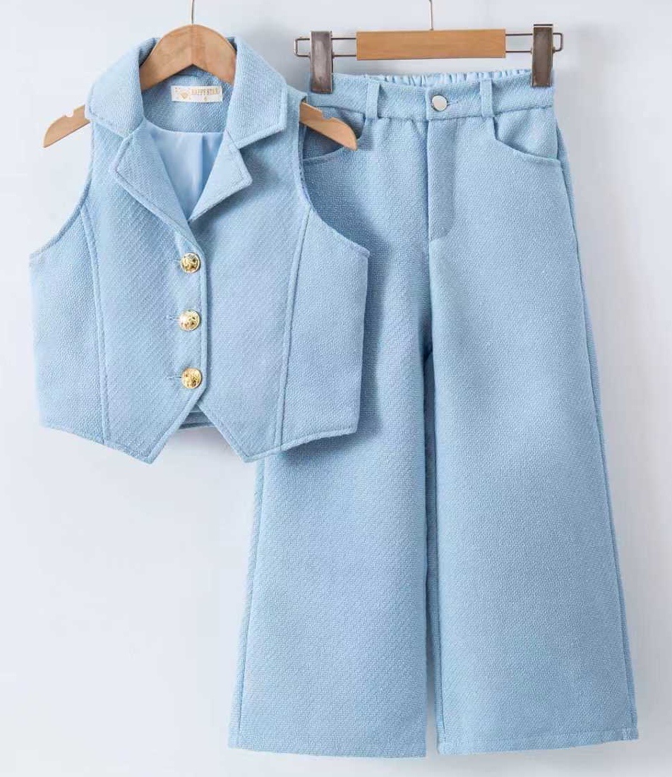 Blauwe meisjes gilet setje met wijde broekspijp. Gemaakt van neutrale stof voor een comfy fit. Verkrijgbaar van maat 98/104 t/m 158/164.