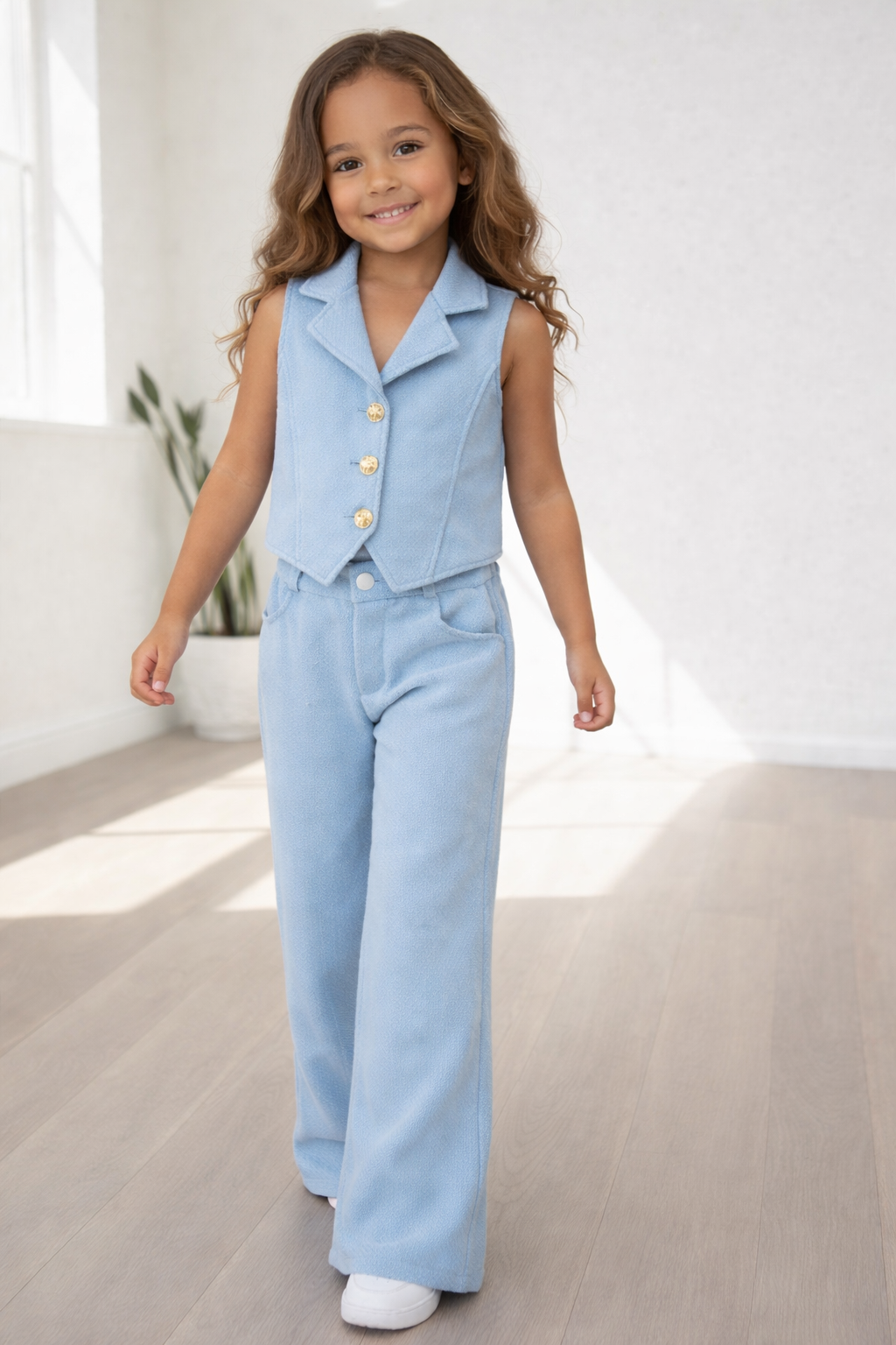 Hoe schattig is dit?! Dit blauwe meisjes setje met gilet en wijde broekspijpen is dé eyecatcher van dit seizoen. Gemaakt van zachte, rekbare stof voor ultiem comfort én stijl. Ideaal voor school, feestje of een dagje weg. Verkrijgbaar van maat 98/104 t/m 158/164. Combineer met sneakers voor een sportieve look of laarsjes voor extra flair!