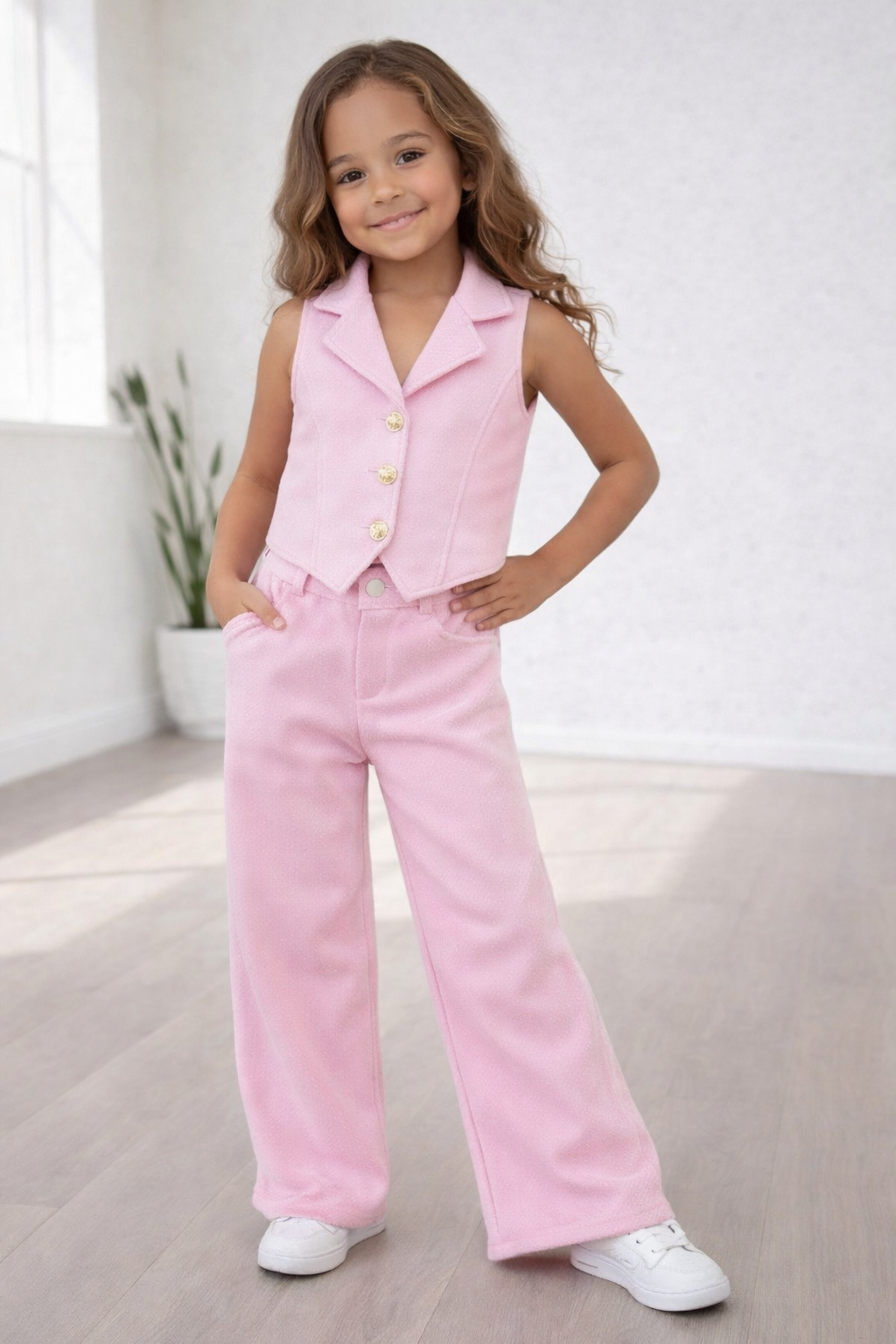 Hoe schattig is dit?! Dit Roze meisjes setje met gilet en wijde broekspijpen is dé eyecatcher van dit seizoen. Gemaakt van zachte, rekbare stof voor ultiem comfort én stijl. Ideaal voor school, feestje of een dagje weg. Verkrijgbaar van maat 98/104 t/m 158/164. Combineer met sneakers voor een sportieve look of laarsjes voor extra flair!