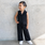 Zwarte meisjes gilet setje met wijde broekspijp. Gemaakt van neutrale stof voor een comfy fit. Verkrijgbaar van maat 98/104 t/m 158/164.