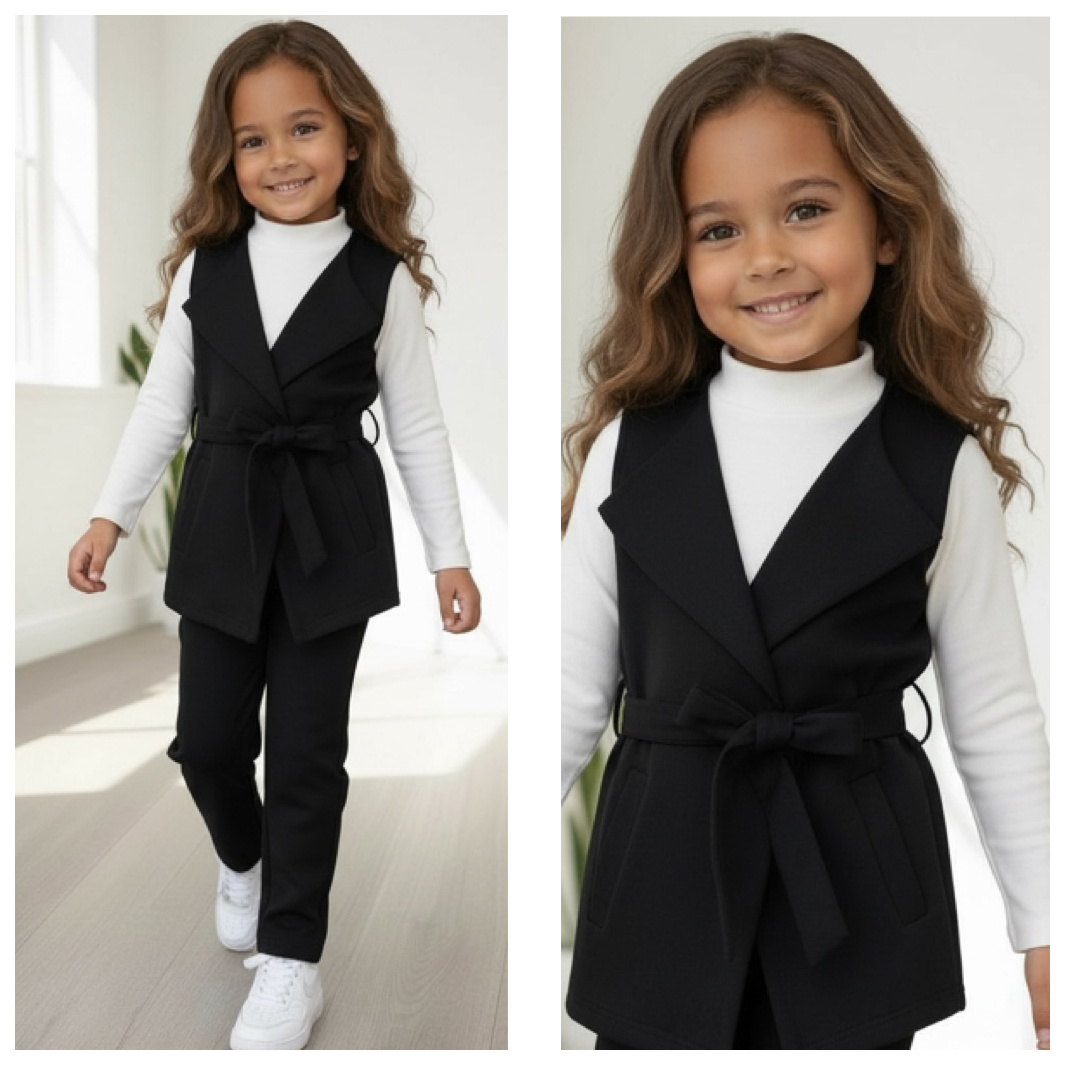 Zwarte meisjes set bestaande uit een blazer en een flared broek. Comfortabel én trendy! Perfect voor meiden wdie houden van fashion. Verkrijgbaar van maat 98/104 t/m 158/164.