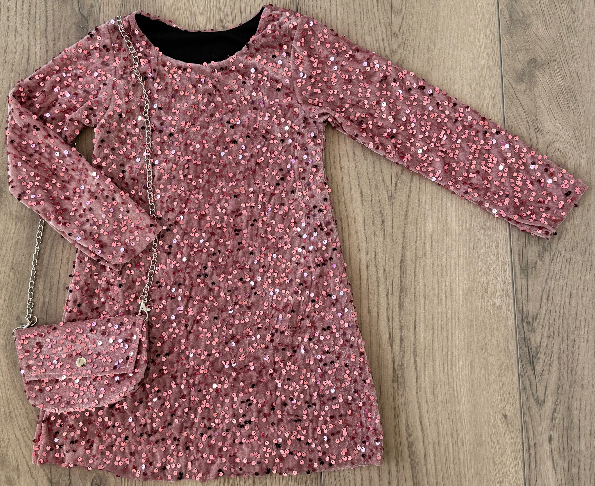Stijlvol roze pailletten jurkje met bijpassend tasje. Perfect voor feestjes, kerst en speciale gelegenheden. Verkrijgbaar in maat 86/92 t/m 146/152.