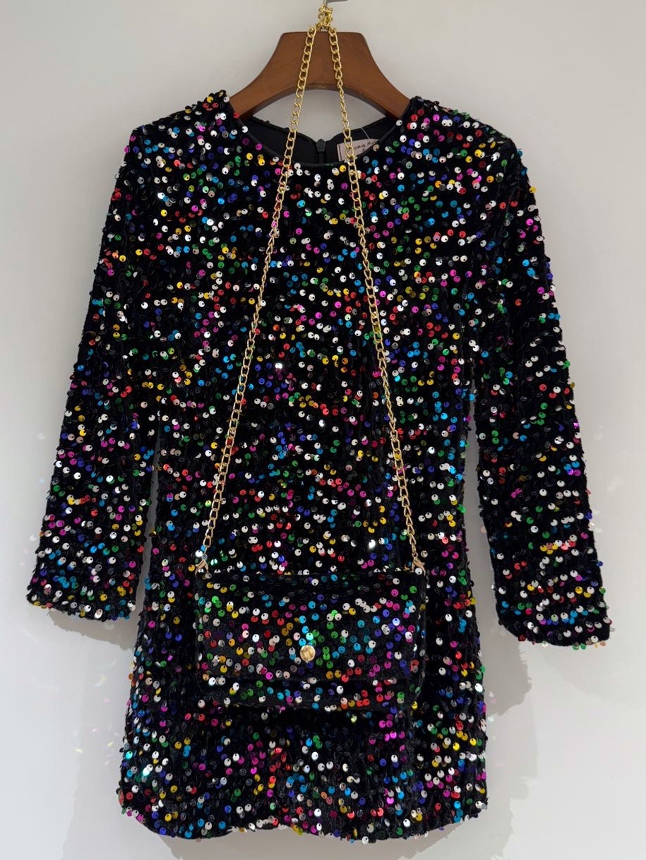 Dit zwarte glitterjurkje met bijpassendtasje is de ultieme feestoutfit voor jouw meisje deze Kerst! De jurk is rijkelijk afgewerkt met fonkelende pailletten in vrolijke kleuren, waardoor ze gegarandeerd zal stralen op elk feest. Het bijpassende schoudertasje maakt de look compleet en is perfect voor kleine schatten. Ideaal voor Kerst, verjaardagen, bruiloften of een ander bijzonder moment. Het jurkje is comfortabel, heeft lichte stretch en een mooie ronde hals. Verkrijgbaar van maat 86/92 t/m 146/152.