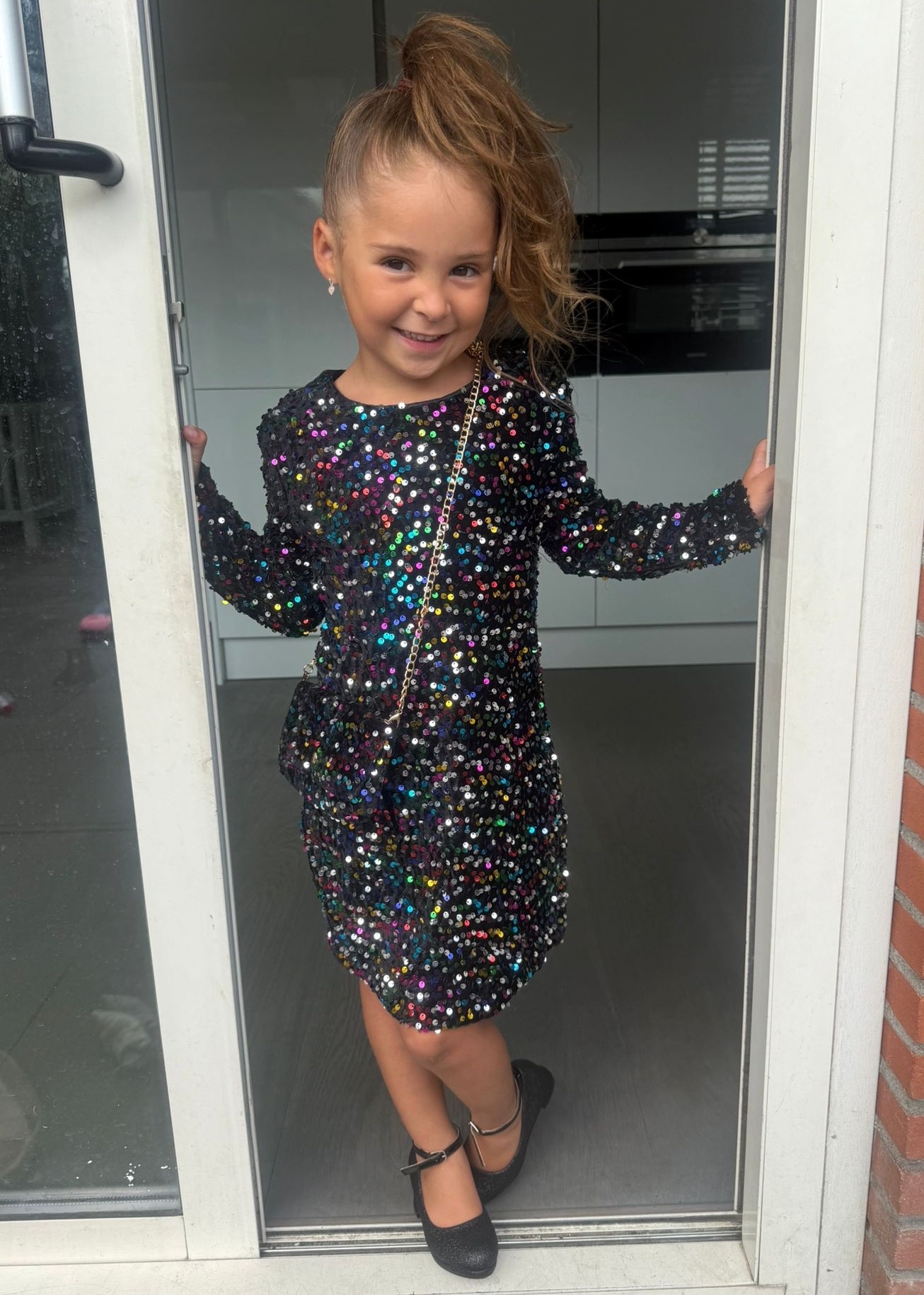 Schitterend zwarte glitterjurkje met bijpassend tasje voor meisjes. Afgewerkt met pailletten, perfect voor Kerst, feestjes of verjaardagen. Maat 86/92 t/m 146/152