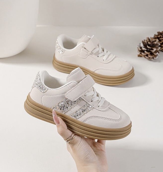 Met klittenband! Deze glitter sneakers zijn een echte blikvanger! Het look-a-like adidas model combineert stijl en comfort – van maat 25 t/m 36!