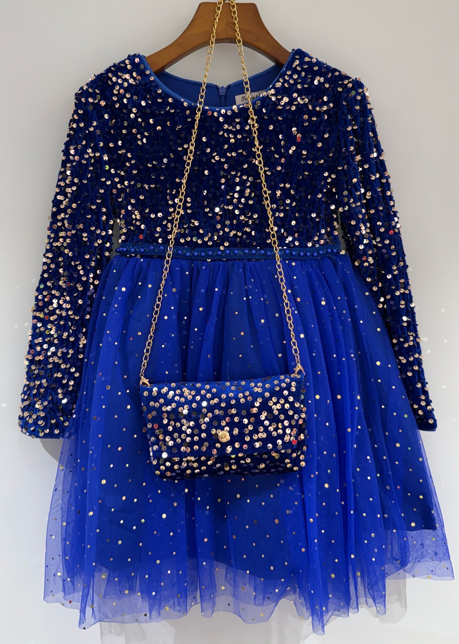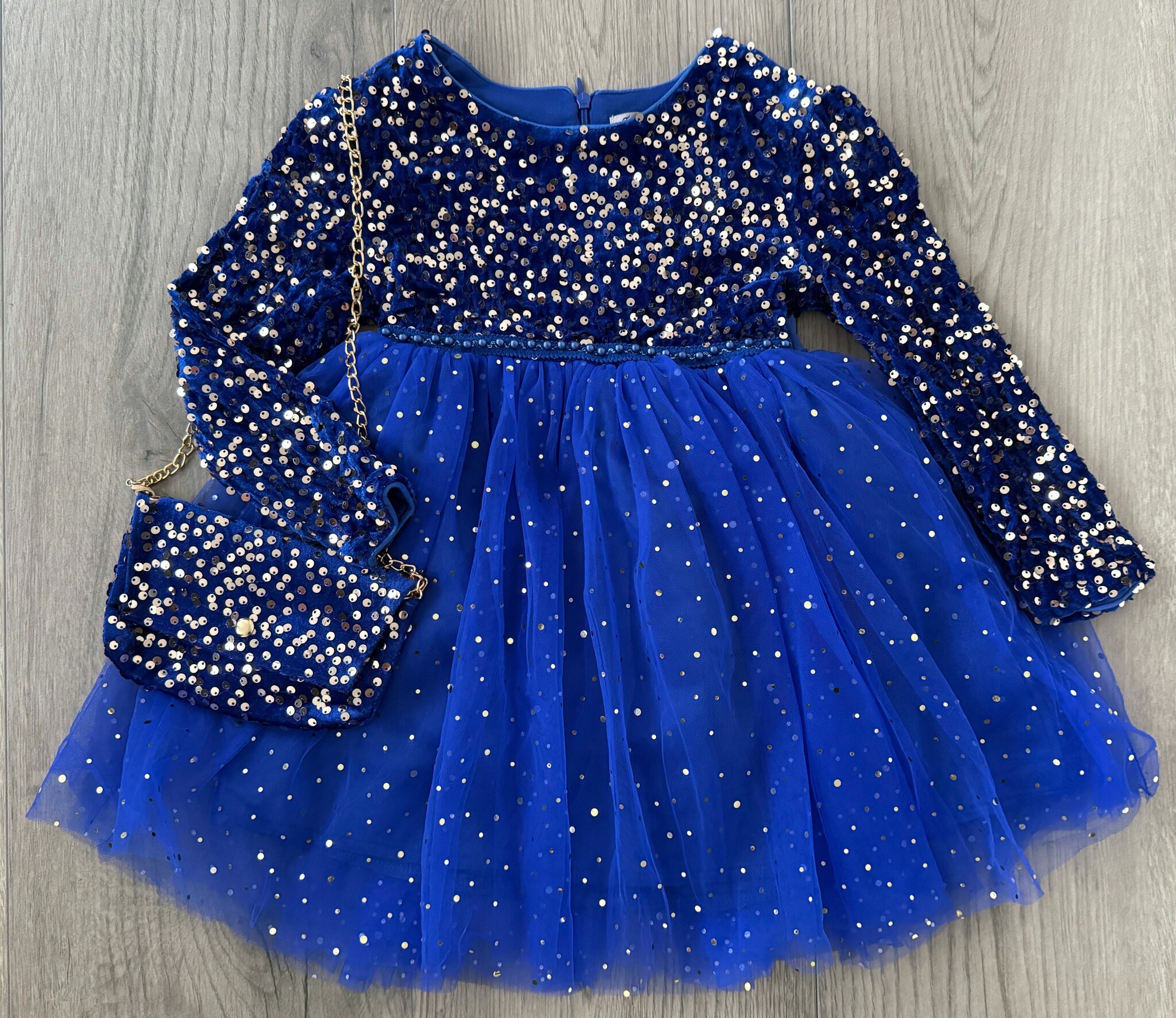 Feestelijk blauwe kerstjurkje met pailletten, tule rok en tasje. Perfect voor de feestdagen! Verkrijgbaar van maat 86/92 t/m 146/152.
