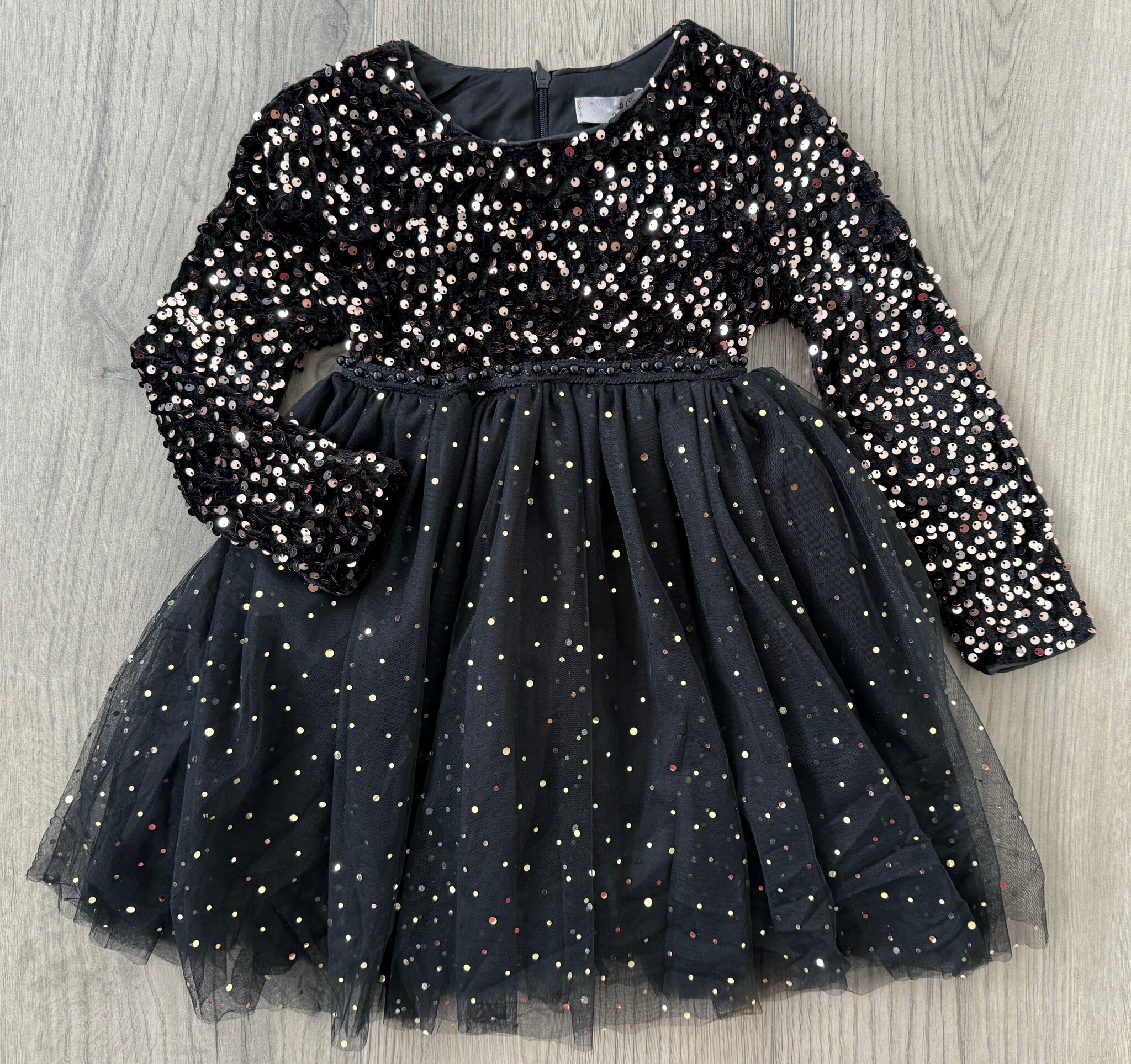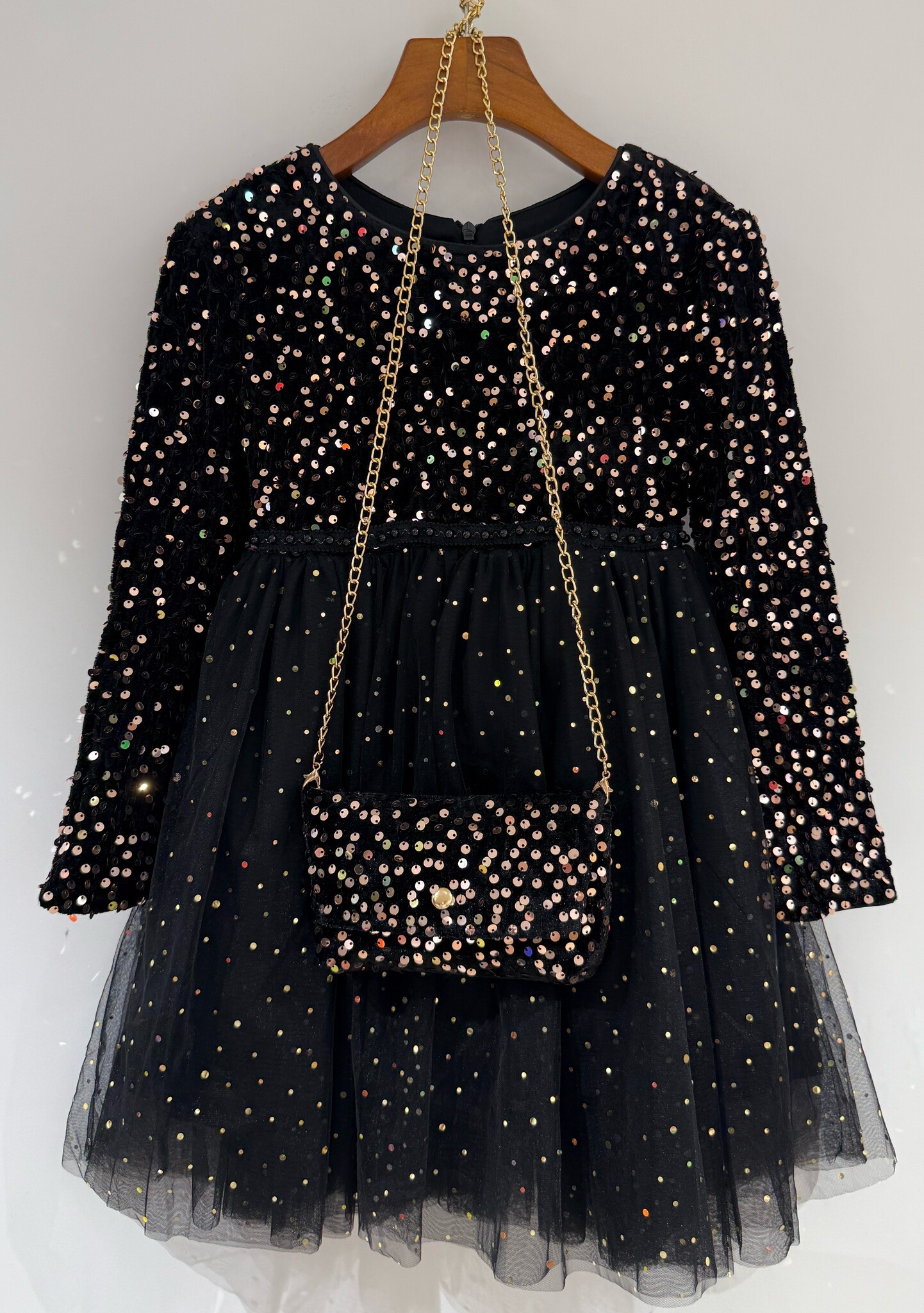 Feestelijk Zwarte kerstjurkje met pailletten, tule rok en tasje. Perfect voor de feestdagen! Verkrijgbaar van maat 86/92 t/m 146/152.