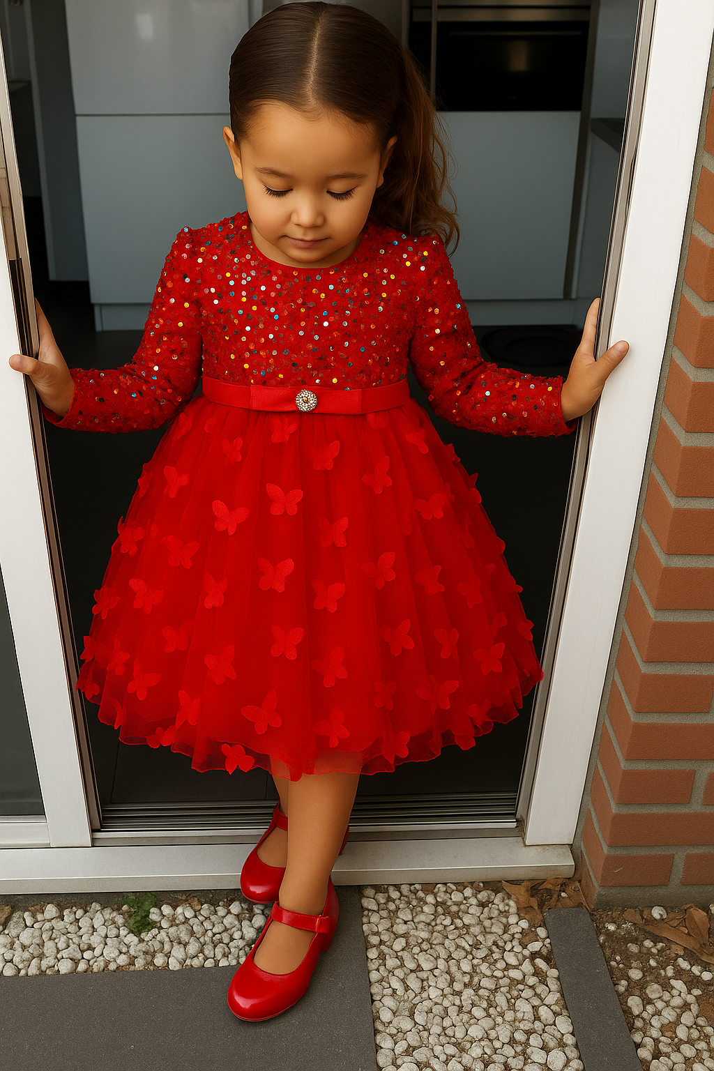 Dit prachtige rode kerstjurkje voor meisjes is een echte eyecatcher tijdens de feestdagen. Het bovenstuk en de mouwen zijn versierd met kleurrijke pailletten die prachtig schitteren in het licht, terwijl de zachte tule rok met vlinders zorgt voor een elegante uitstraling.