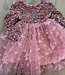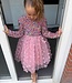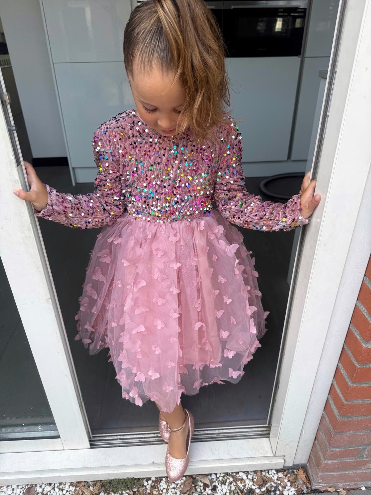 Feestelijk roze kerstjurkje met pailletten, tule rok met vlinders. Perfect voor de feestdagen! Verkrijgbaar van maat 86/92 t/m 146/152.