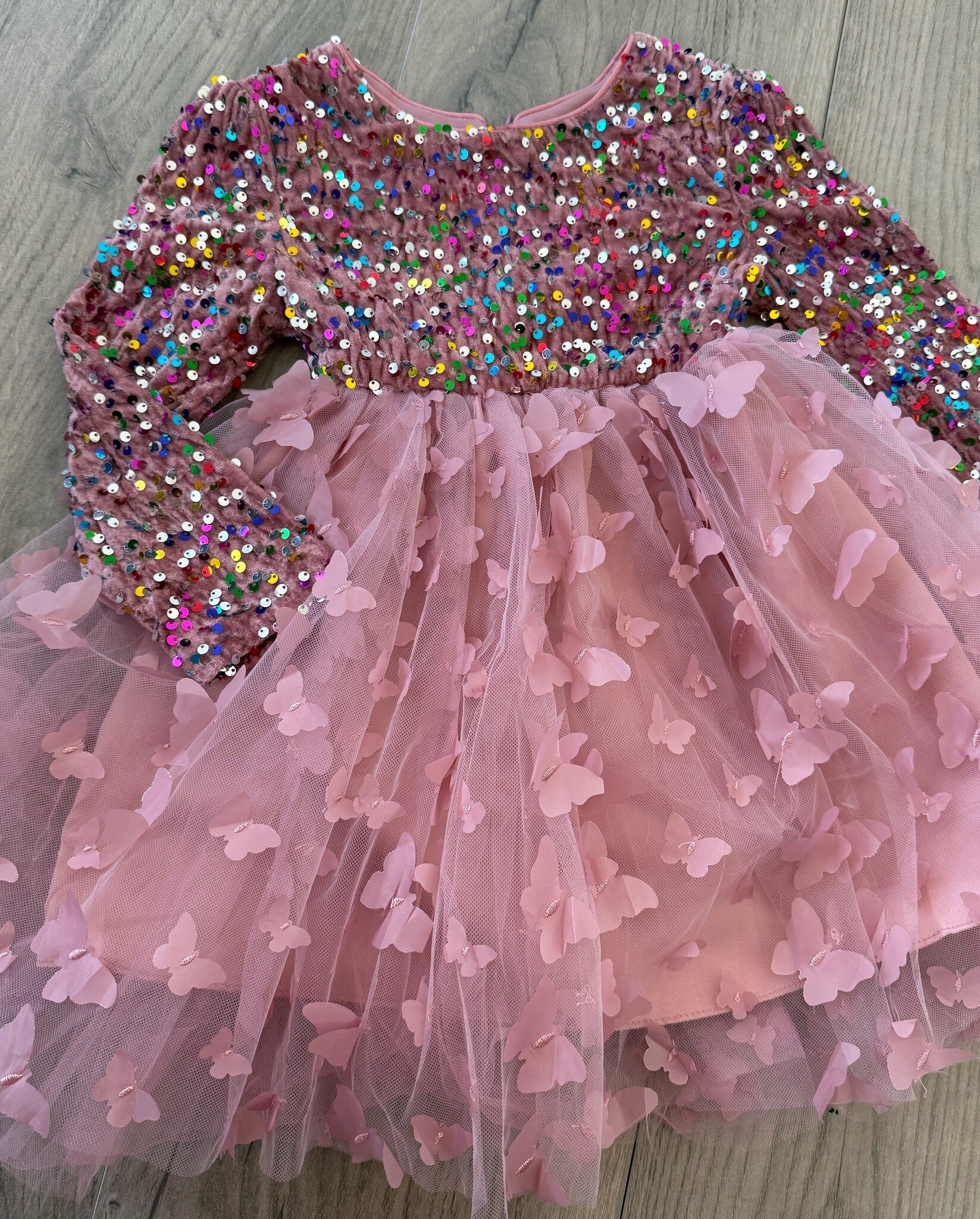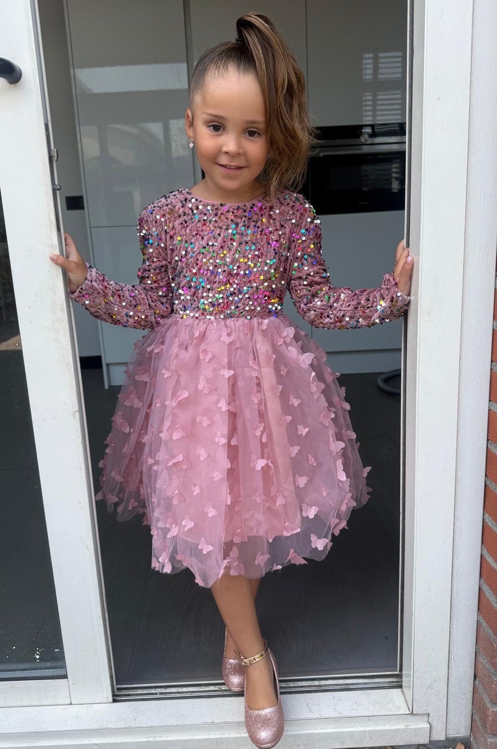 Dit prachtige rozekleurige kerstjurkje voor meisjes is een echte eyecatcher tijdens de feestdagen. Het bovenstuk en de mouwen zijn versierd met kleurrijke pailletten die prachtig schitteren in het licht, terwijl de zachte tule rok met vlinders zorgt voor een elegante uitstraling.