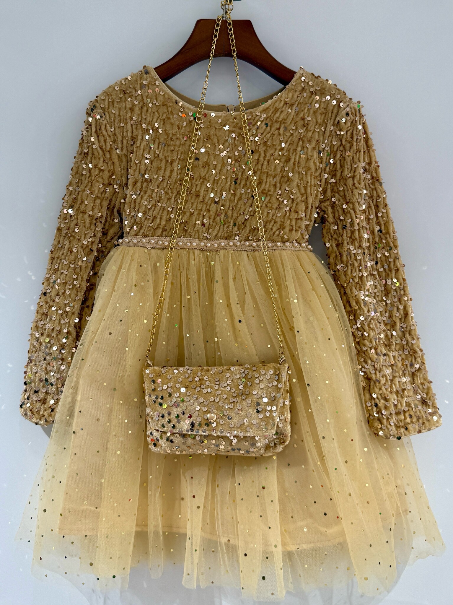 Feestelijk goude kerstjurkje met pailletten, tule rok en tasje. Perfect voor de feestdagen! Verkrijgbaar van maat 86/92 t/m 146/152.