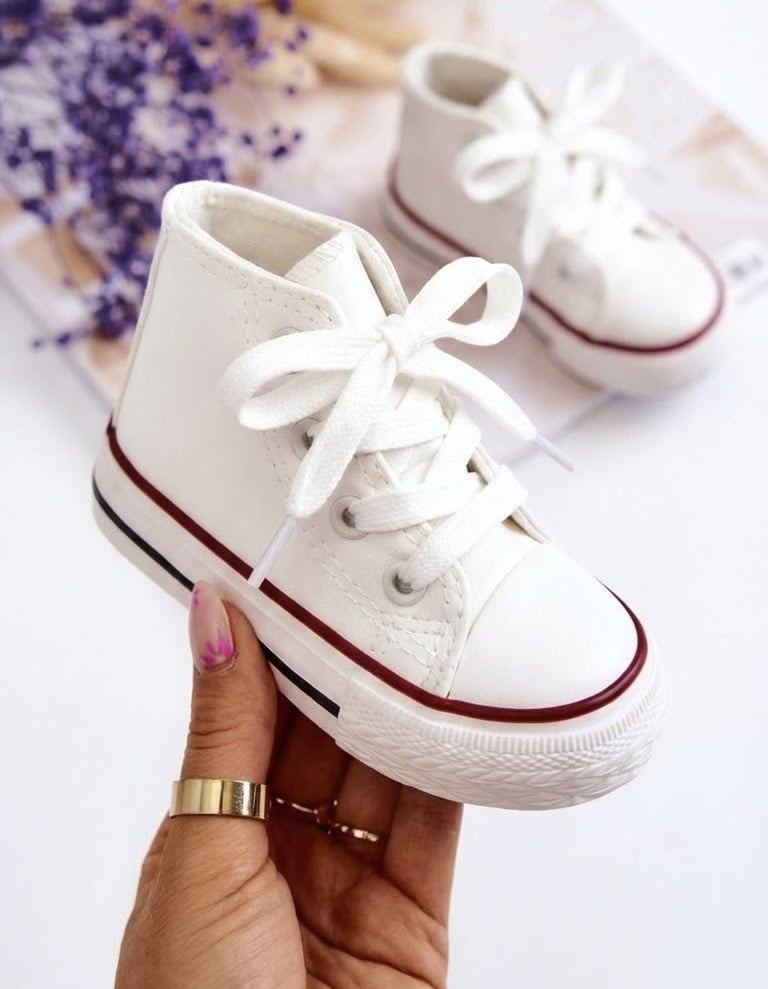 Tijdloze witte hoge sneakers voor kids. Comfortabel, stevig en perfect voor elke outfit. Makkelijk te combineren en geschikt voor dagelijks gebruik. Verkrijgbaar in maat 18 t/m 29.