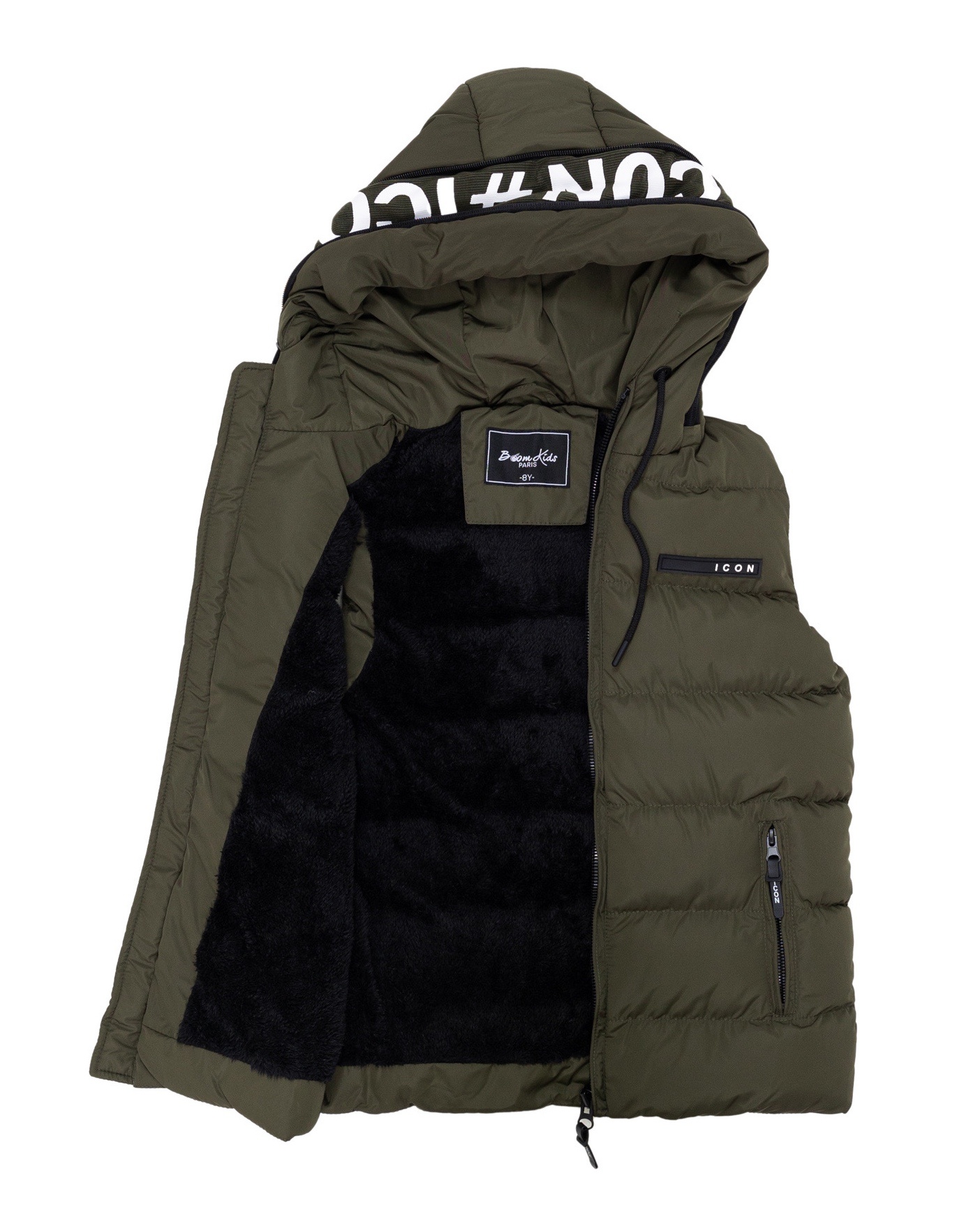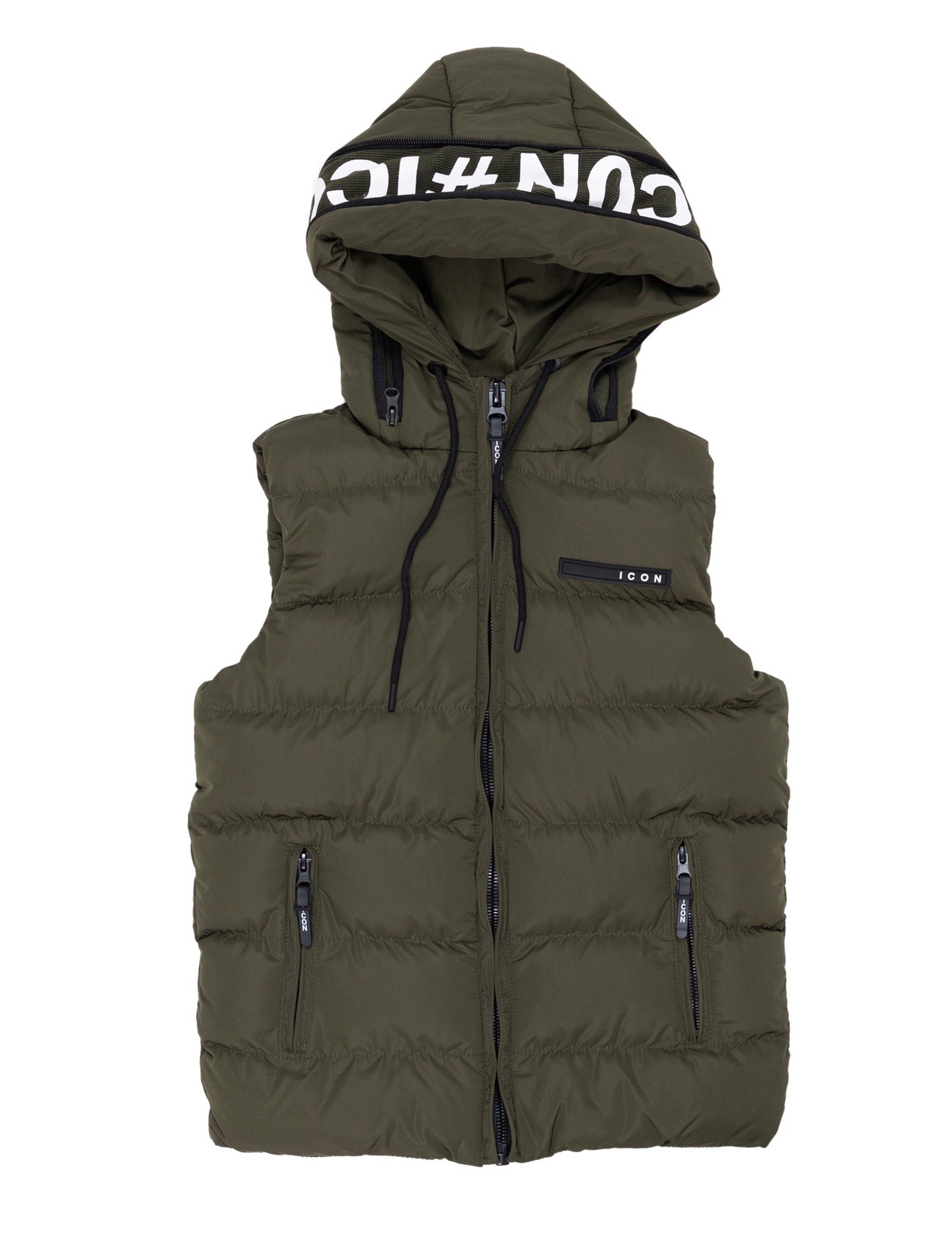 De binnenkant is afgewerkt met een zwarte voering en opvallende ICON-opdruk langs de capuchonrand, wat zorgt voor een sportieve en trendy uitstraling. De capuchon biedt extra bescherming tegen wind en kou, terwijl de stevige ritssluiting en praktische zakken zorgen voor optimaal gebruiksgemak. Op de borst prijkt subtiel het ICON-logo als finishing touch.