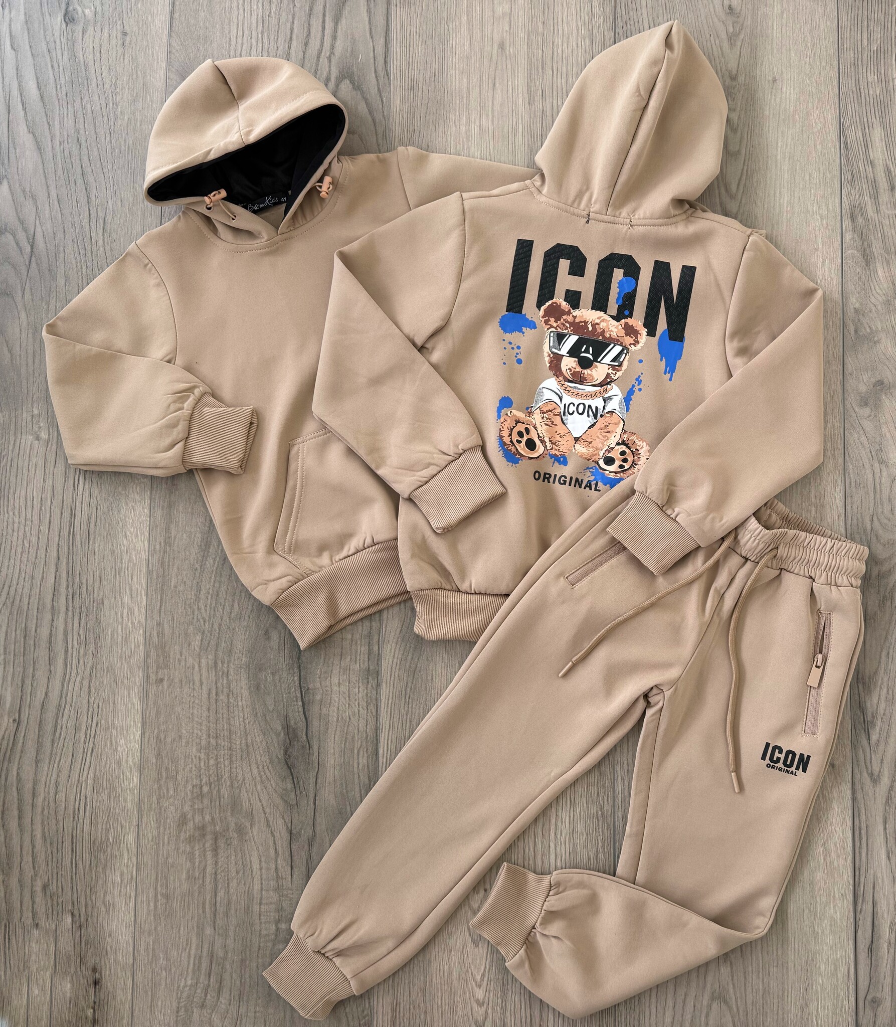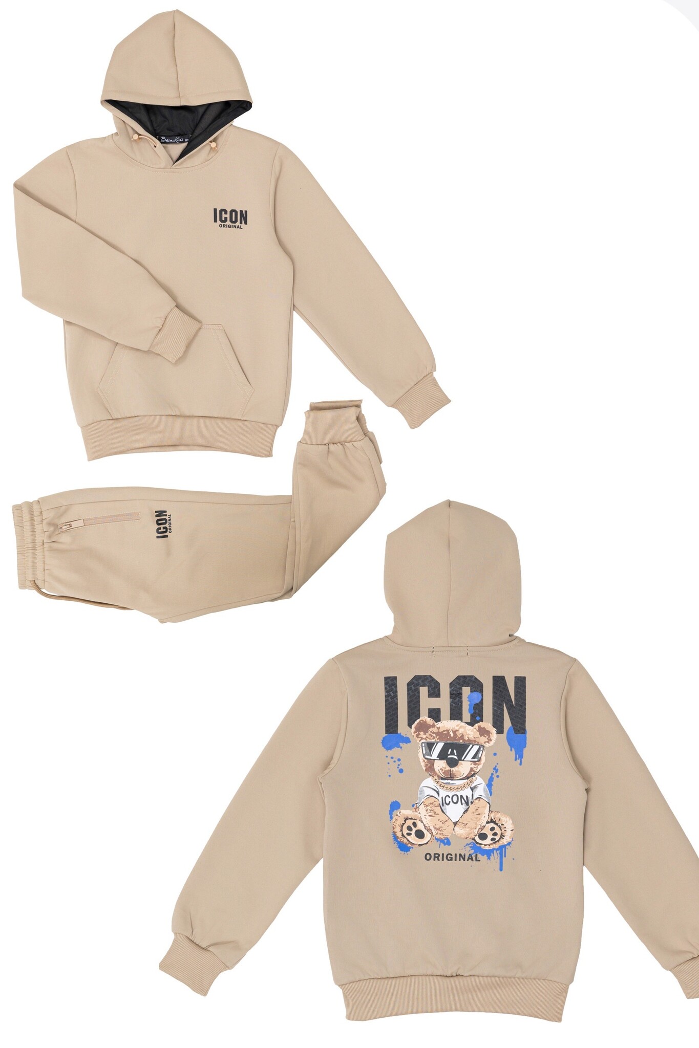 Trendy ICON joggingpak voor kinderen in beige. Hoodie met teddybeer-print en bijpassende jogger. Comfortabel en stijlvol, verkrijgbaar in maat 104/110 t/m 158/164.