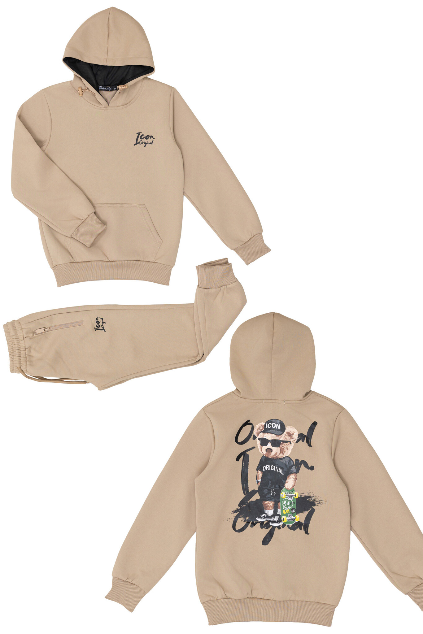 Beige 2-delig ICON joggingpak met teddybeerprint. Comfortabel en trendy voor jongens en meisjes!