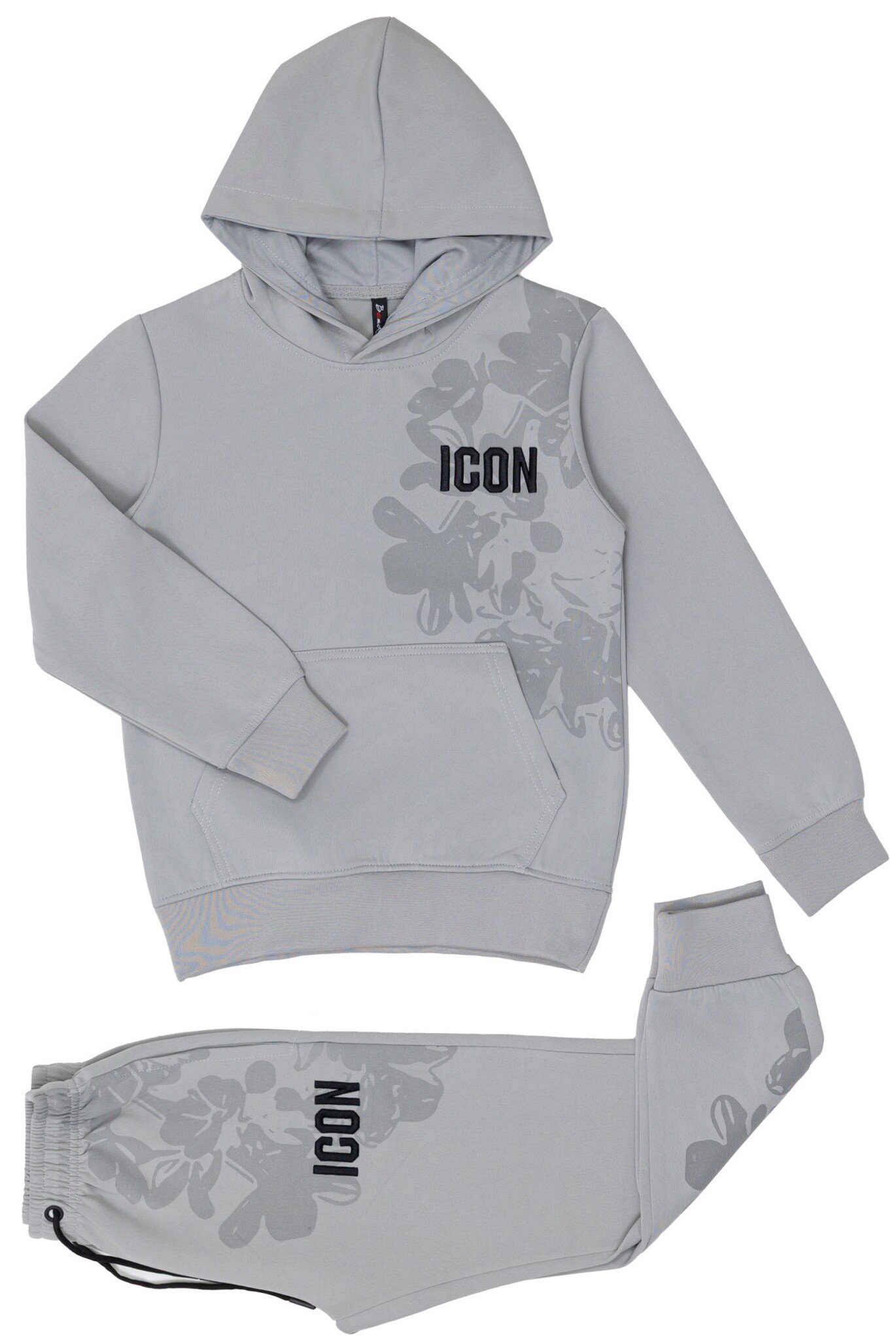 Laat je kind shinen in dit ICON joggingpak grijs met print! Het setje bestaat uit een zachte hoodie met kangoeroezak en ICON-logo, gecombineerd met een jogger met stoere printdetails en elastische taille.