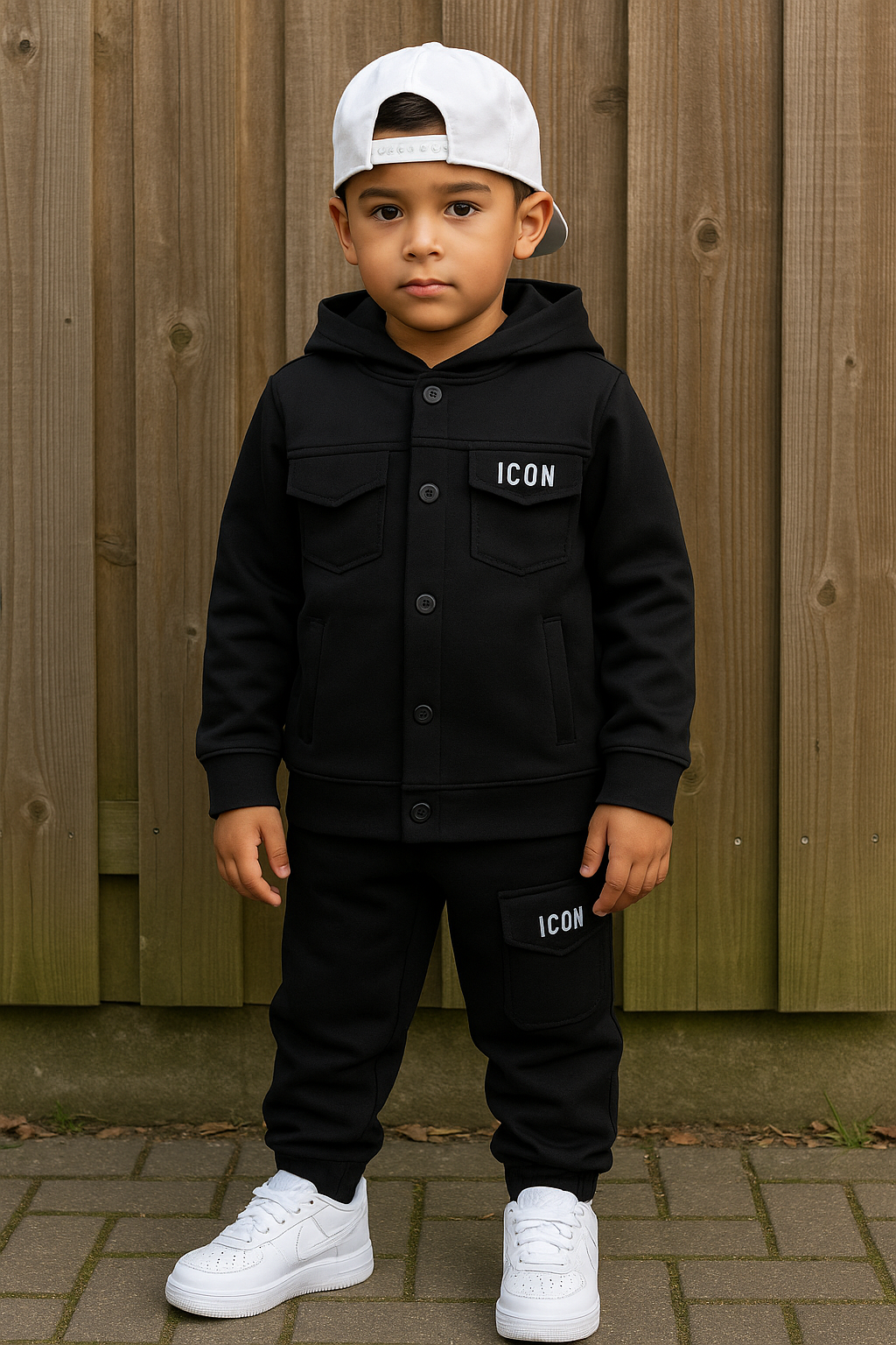 Dit ICON joggingpak in zwart is een echte musthave voor kids die er stoer én comfortabel bij willen lopen. Het setje bestaat uit een hoodie/jas met knoopsluiting en ICON-logo op borst en broekzak. De bijpassende joggingbroek heeft een relaxte pasvorm met elastische tailleband en stoere cargozakken.