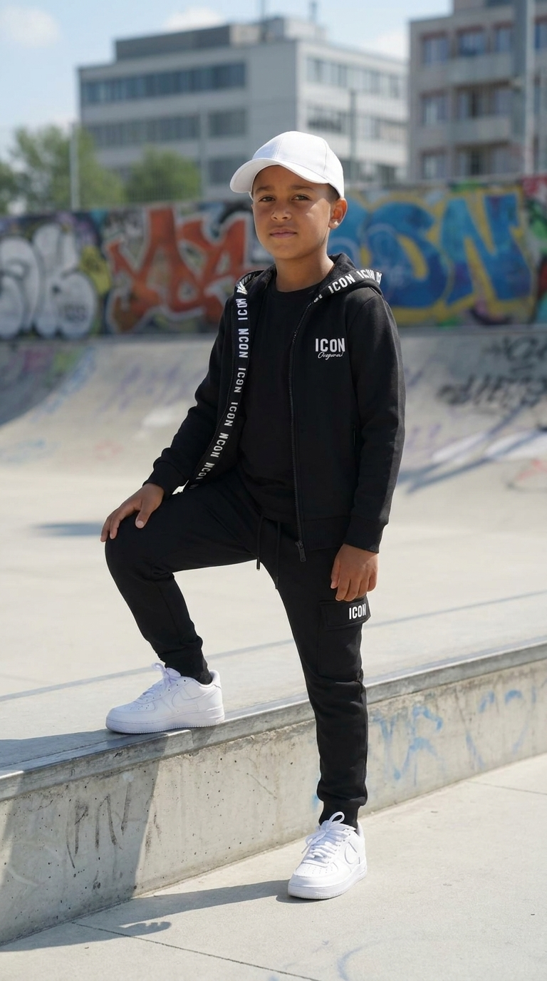 Deze stoere Beige joggingset is perfect voor jongens die houden van een sportieve en moderne look. De set bestaat uit een comfortabel vest met ritssluiting en een bijpassende joggingbroek.