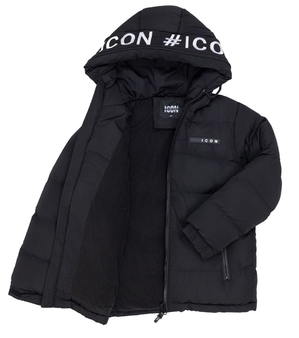 Stoere zwarte ICON winterjas voor jongens met fleecevoering, afritsbare capuchon en #ICON opdruk op de capuchon. Warm, sportief en perfect voor elk winterweer!