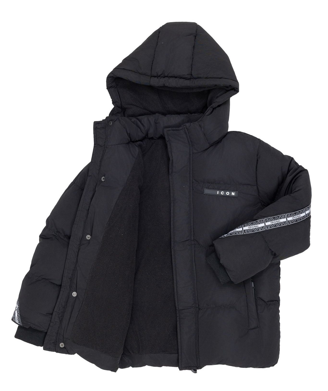 Deze ICON winterjas voor jongens is een echte eyecatcher dankzij het ICON logo. De jas is uitgevoerd in zwart met een zachte fleecevoering aan de binnenzijde, een gevoerde capuchon en een stoere pasvorm. De rits en mouwboorden zijn stevig afgewerkt.