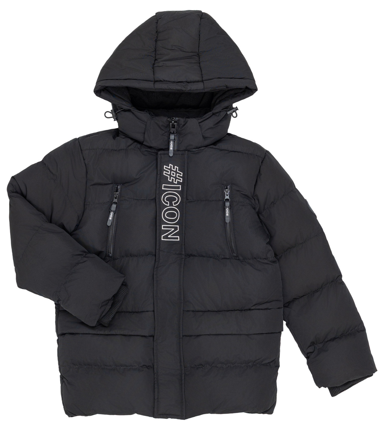 Stoere Zwarte ICON winterjas voor jongens met fleecevoering, afritsbare capuchon en #ICON opdruk. Warm, sportief en perfect voor elk winterweer!