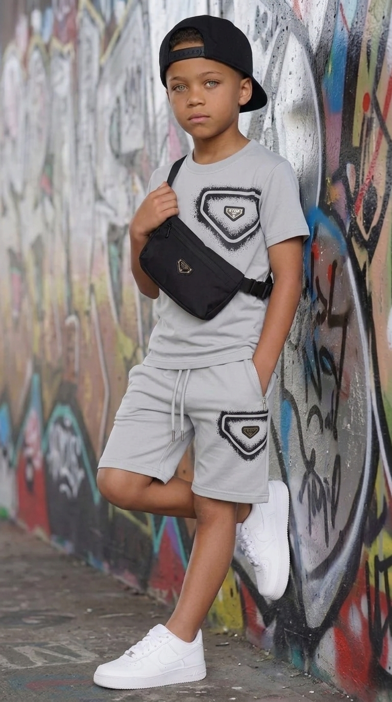 Stoere Icon Original zomer set voor jongens met khaki T-shirt en bijpassende short. Comfortabel, trendy en perfect voor warme dagen. Ideaal voor vakantie en buitenspelen. Verkrijgbaar in maat 98/104 t/m 158/164.