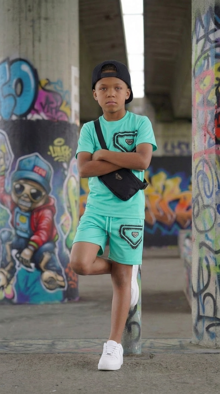 Stoere Icon Original zomer set voor jongens met turquoise T-shirt en bijpassende short. Comfortabel, trendy en perfect voor warme dagen. Ideaal voor vakantie en buitenspelen. Verkrijgbaar in maat 98/104 t/m 158/164.