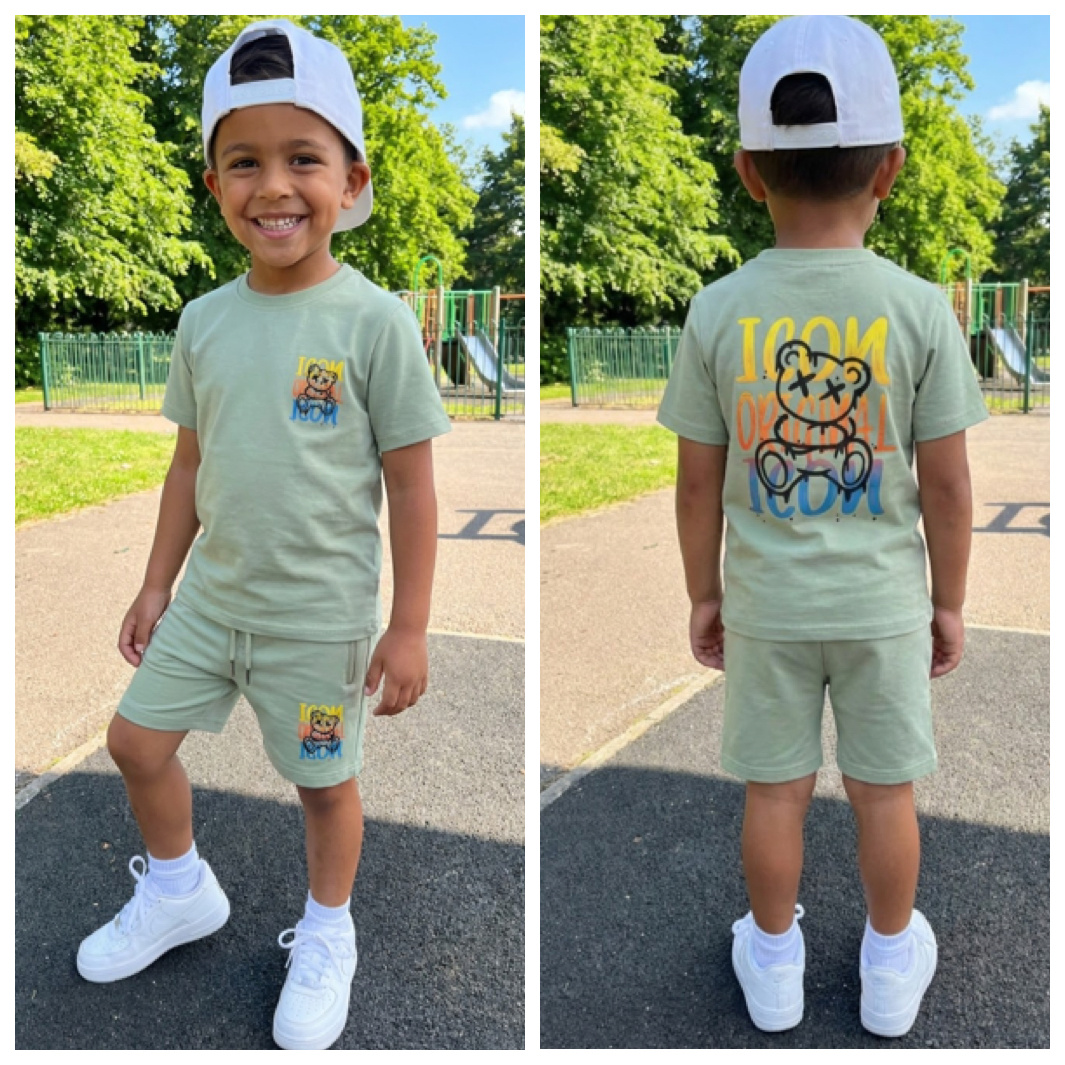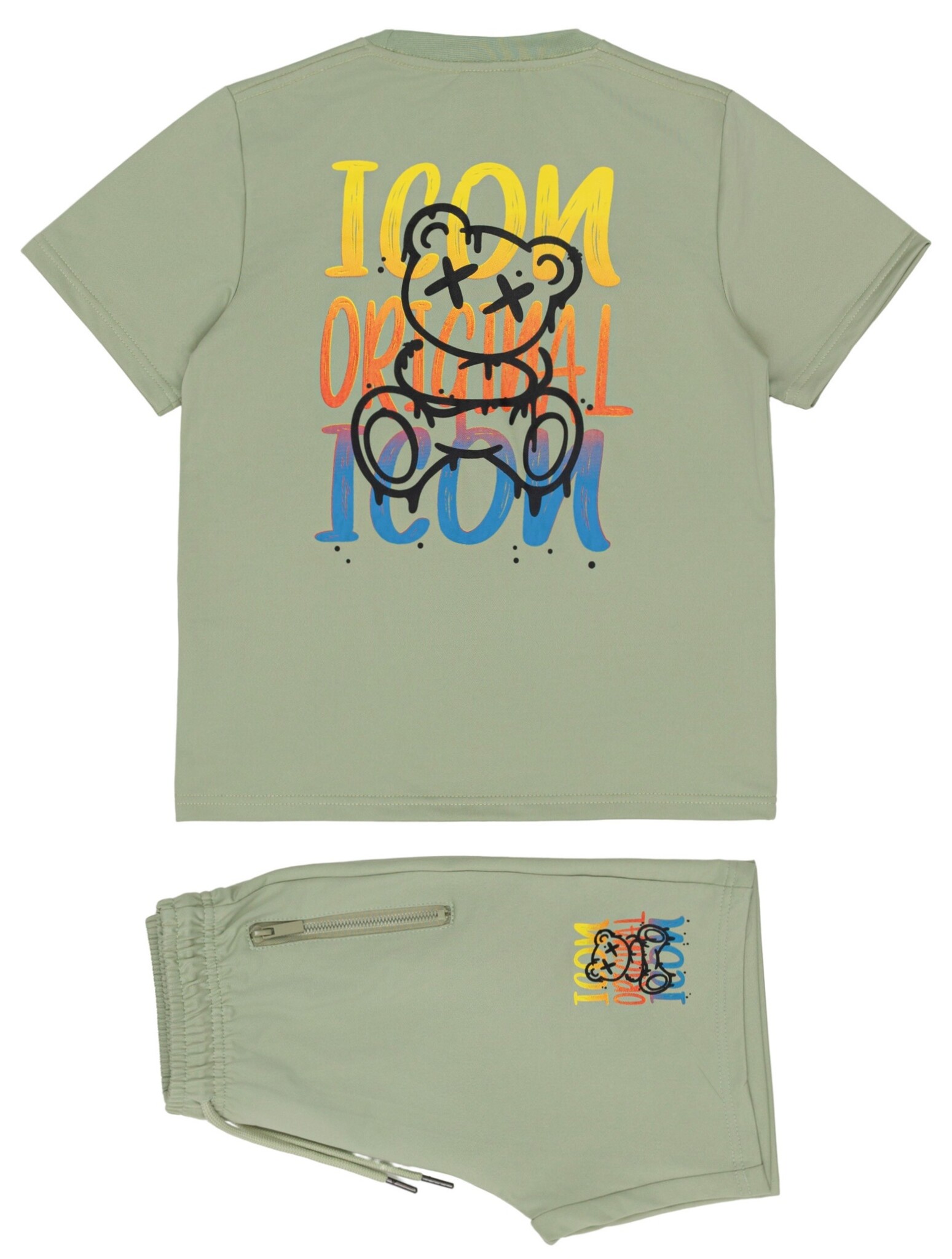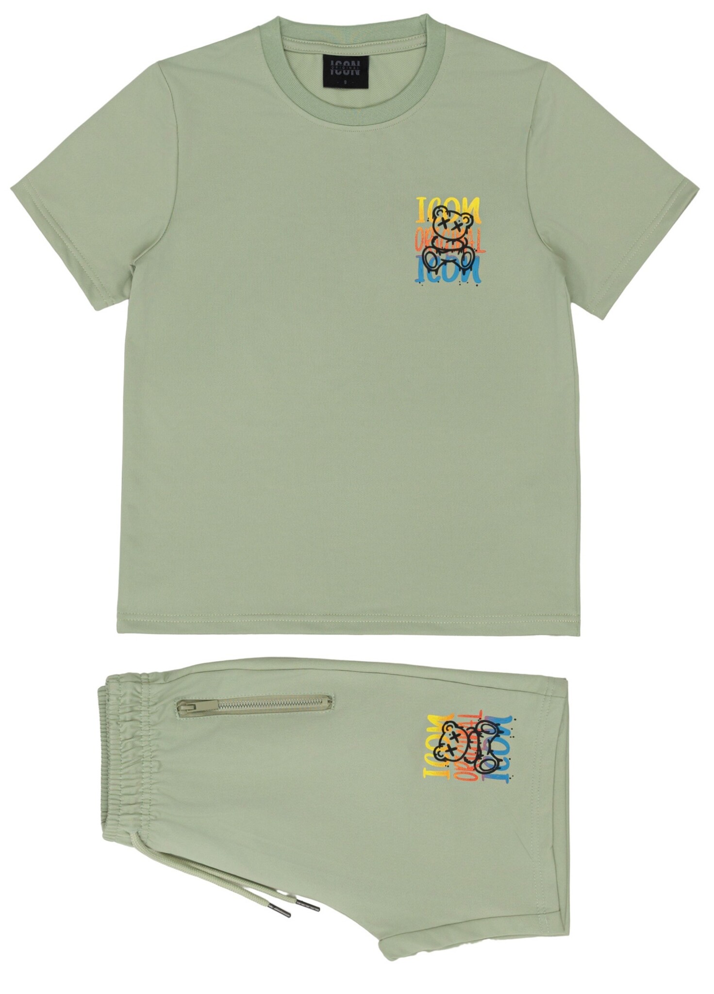 Deze stoere Icon Original zomer set in groen is perfect voor jongens die houden van een frisse en trendy look. De set bestaat uit een comfortabel T-shirt en een bijpassende short, beide voorzien van een opvallende ICON teddy print.