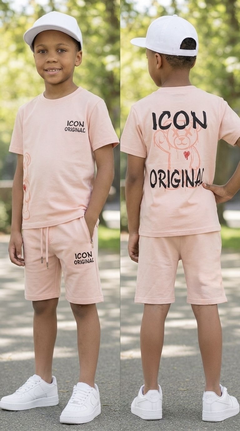 Deze stoere Icon Original zomer set is perfect voor jongens die houden van een trendy en comfortabele look. De set bestaat uit een T-shirt met opvallende ICON teddy print en een bijpassende short, ideaal voor warme dagen.