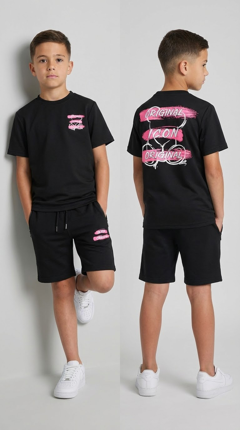 Stoere Icon Original zomer set voor jongens met zwart T-shirt en bijpassende short. Comfortabel, trendy en perfect voor warme dagen. Ideaal voor vakantie en buitenspelen. Verkrijgbaar in maat 98/104 t/m 158/164.