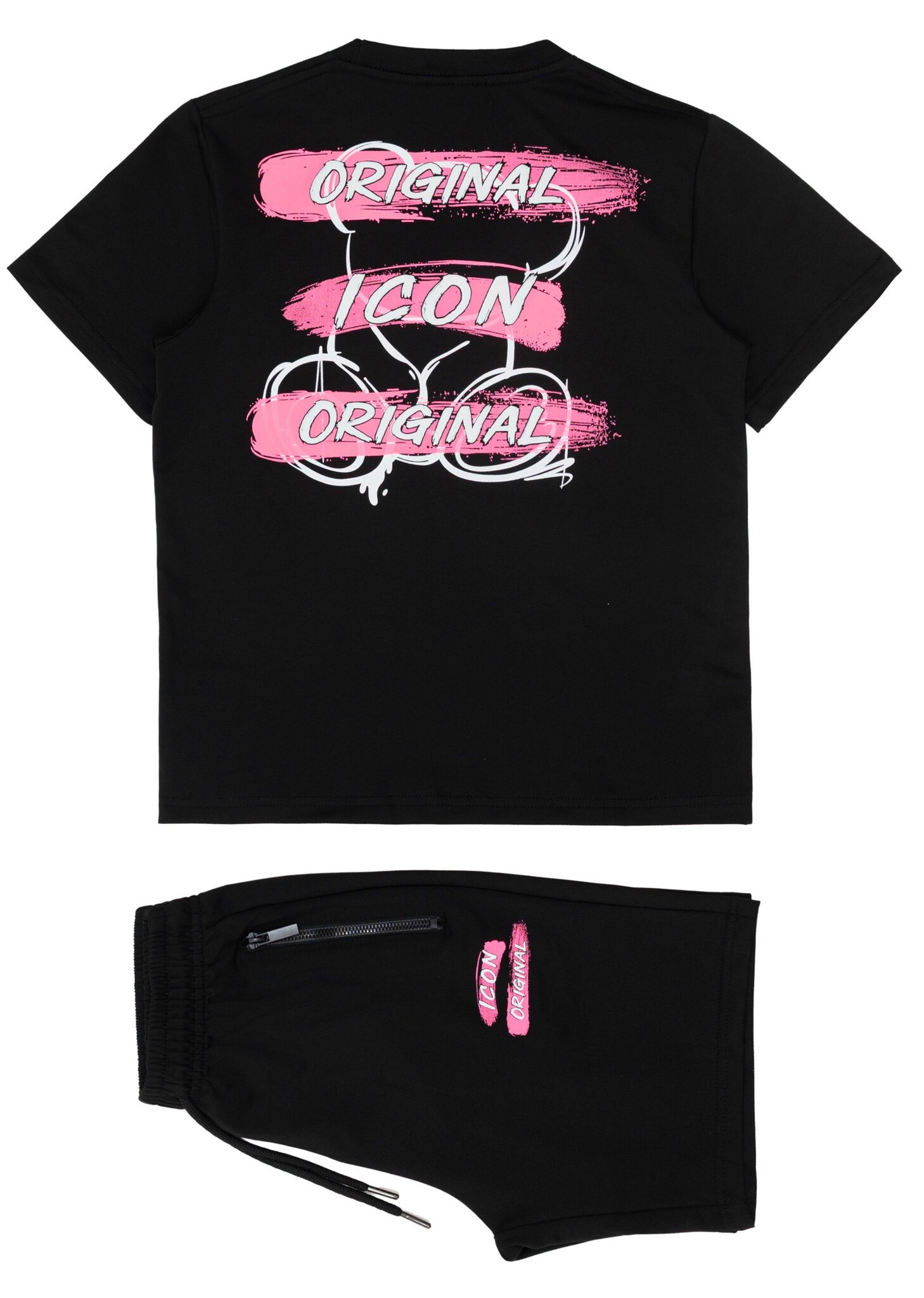 Deze stoere Icon Original zomer set in het zwart is een echte eyecatcher voor jongens. De set bestaat uit een comfortabel T-shirt met opvallende ICON teddy print en een bijpassende short met sportieve uitstraling.