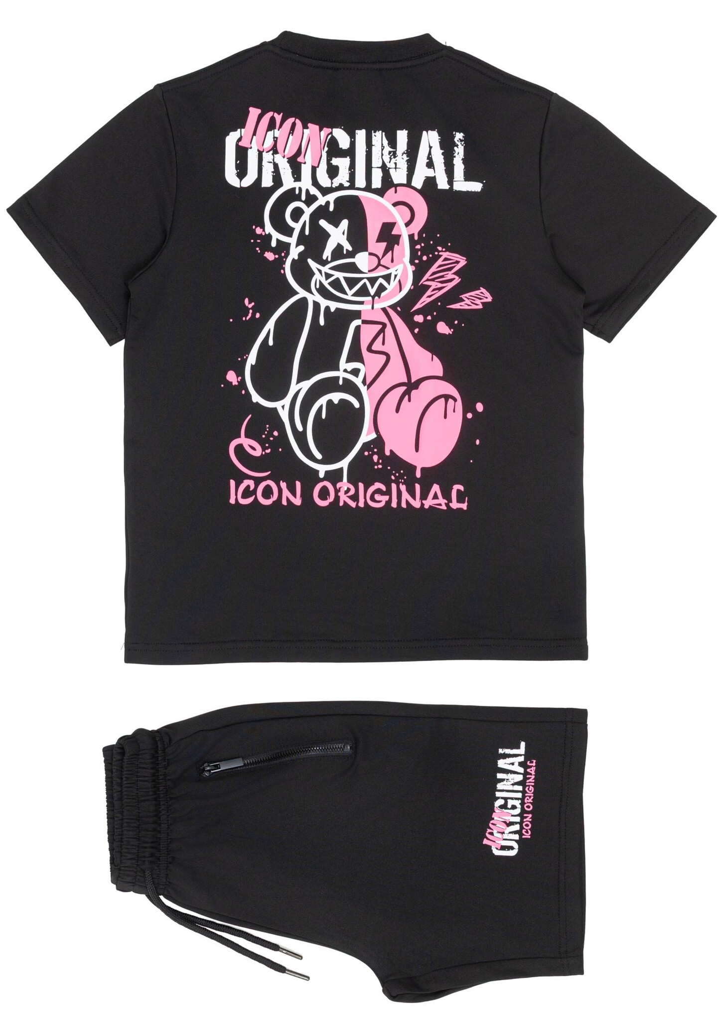 Deze stoere Icon Original zomer set in het zwart is een echte eyecatcher voor jongens. De set bestaat uit een comfortabel T-shirt met opvallende ICON teddy print en een bijpassende short met sportieve uitstraling.