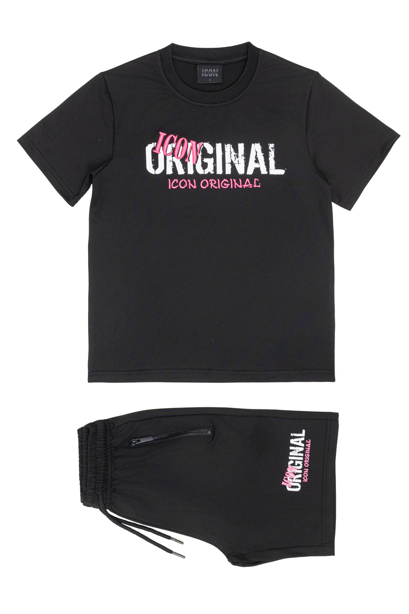 Stoere Icon Original zomer set voor jongens met zwart T-shirt en bijpassende short. Comfortabel, trendy en perfect voor warme dagen. Ideaal voor vakantie en buitenspelen. Verkrijgbaar in maat 98/104 t/m 158/164.