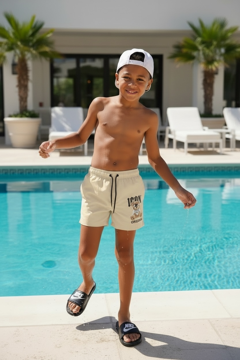 Stoere Icon zwembroek voor jongens met. Comfortabel, trendy en perfect voor warme dagen. Ideaal voor vakantie en buitenspelen. Verkrijgbaar in maat 98/104 t/m 158/164.