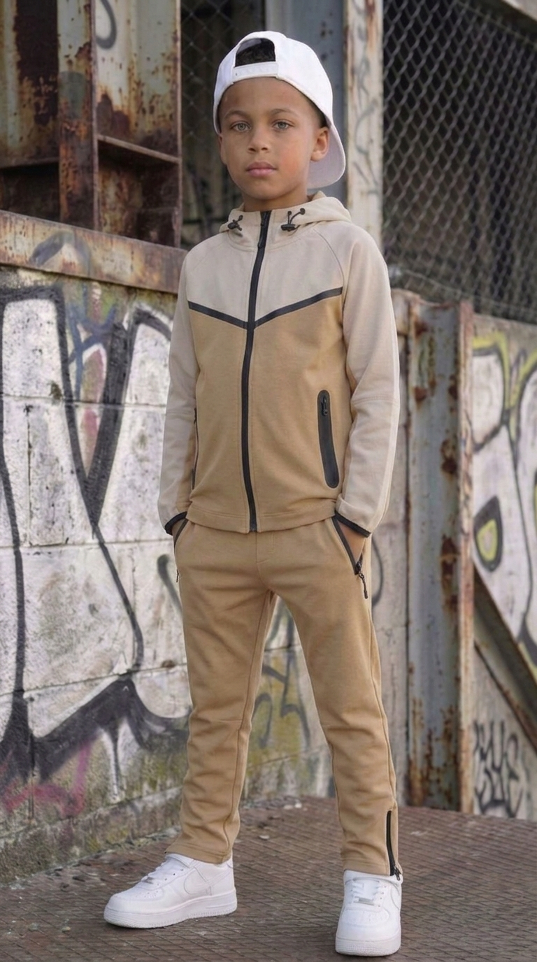 Stoere beige joggingset voor jongens met vest en cargo jogger. Comfortabel, trendy en ideaal voor elke dag.