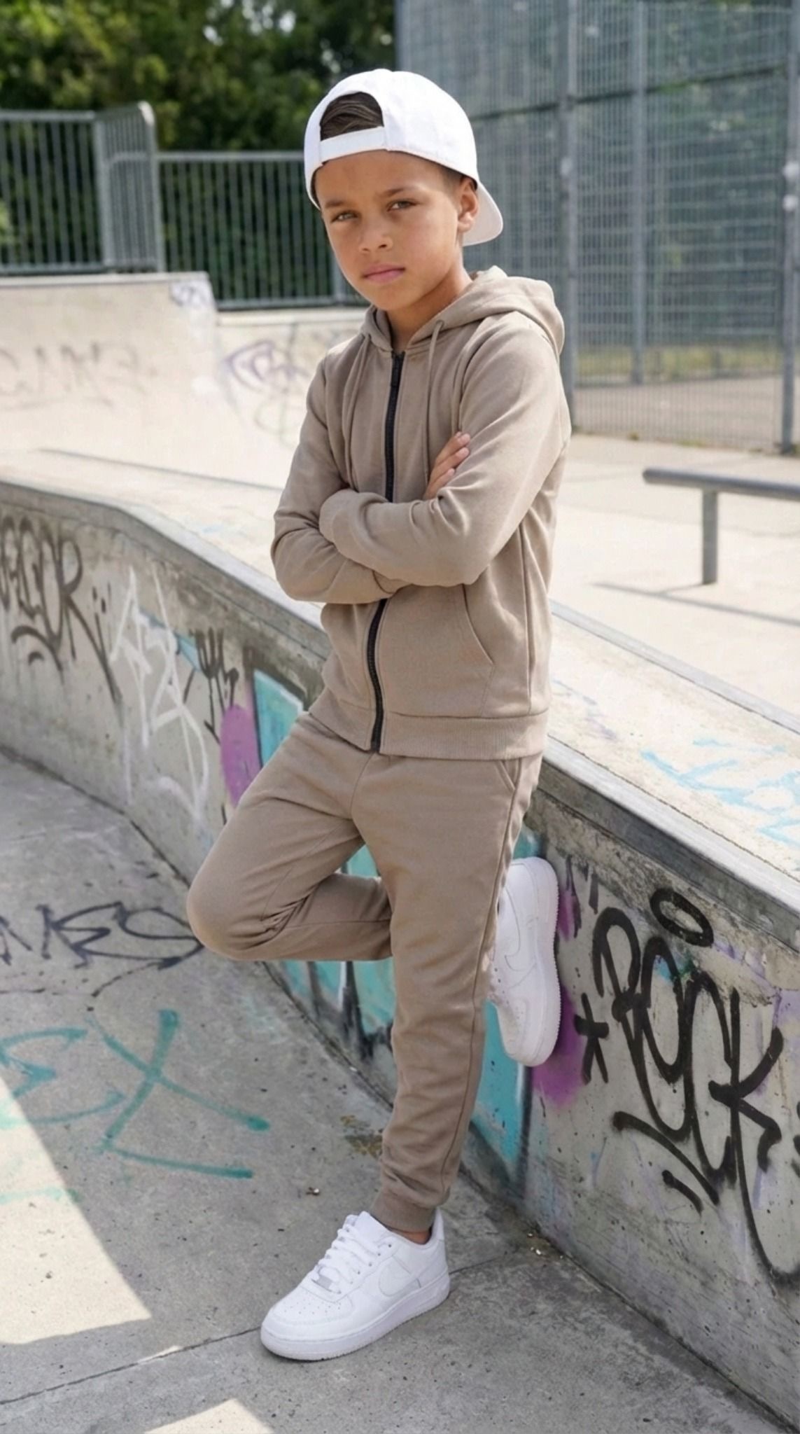 Stoere beige joggingset voor jongens met vest en cargo jogger. Comfortabel, trendy en ideaal voor elke dag.