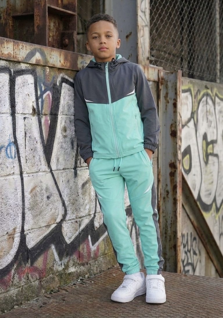 Deze stoere joggingset is perfect voor jongens die houden van een sportieve en moderne look. De set bestaat uit een comfortabel vest met ritssluiting en een bijpassende joggingbroek.
