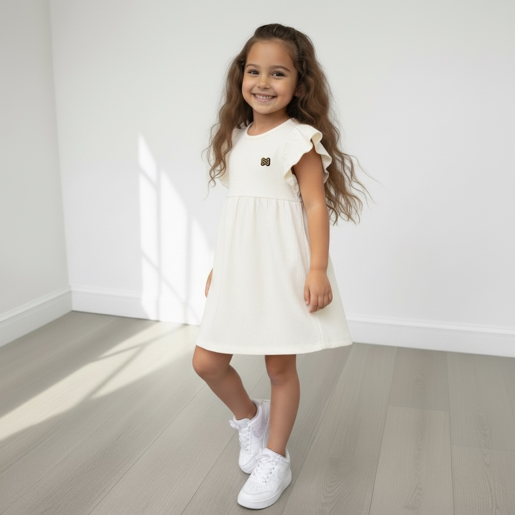 De zachte crèmekleur, speelse ruches en comfortabele pasvorm maken dit jurkje een echte favoriet. Perfect voor feestelijke gelegenheden, maar ook heerlijk om gewoon elke dag te dragen.