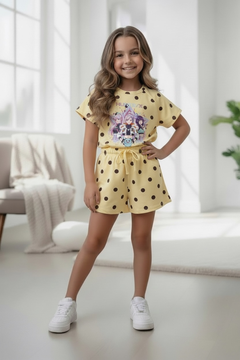 Fan van K-pop én de Netflix film KPop Demon Hunters? Dan is dit meisjes setje precies wat je zoekt! De outfit bestaat uit een T-Shirt met Huntr/x print (Rumi, Mira & Zoey) en een bijpassende broekje