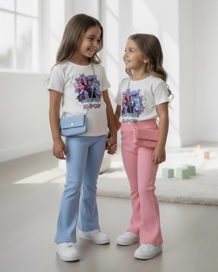 Fan van K-pop én de Netflix film KPop Demon Hunters? Dan is dit meisjes setje precies wat je zoekt! De outfit bestaat uit een T-Shirt met Huntr/x print (Rumi, Mira & Zoey) en een bijpassende flared legging.