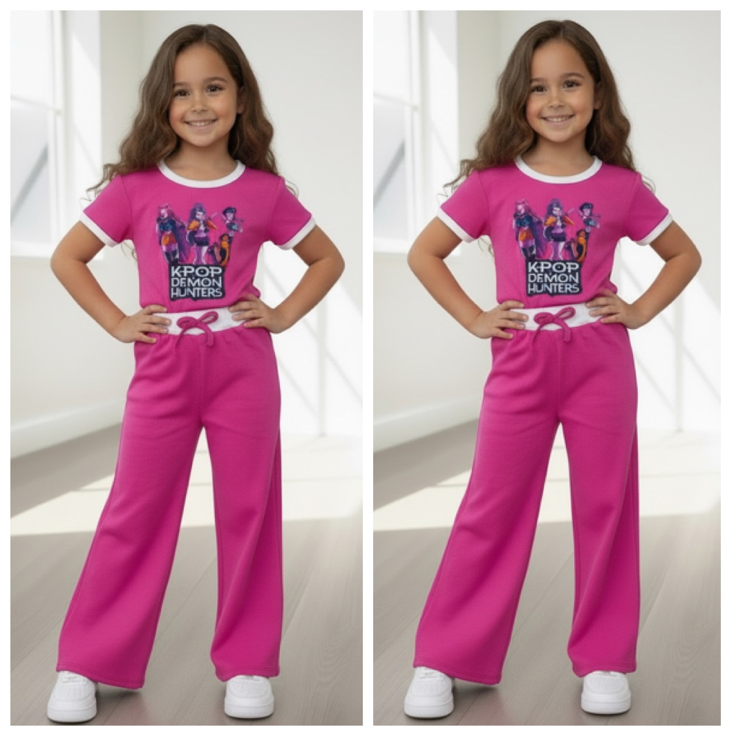 Fan van K-pop én de Netflix film KPop Demon Hunters? Dan is dit roze meisjes setje precies wat je zoekt! De outfit bestaat uit een T-Shirt met Huntr/x print (Rumi, Mira & Zoey) en een flared jogger.