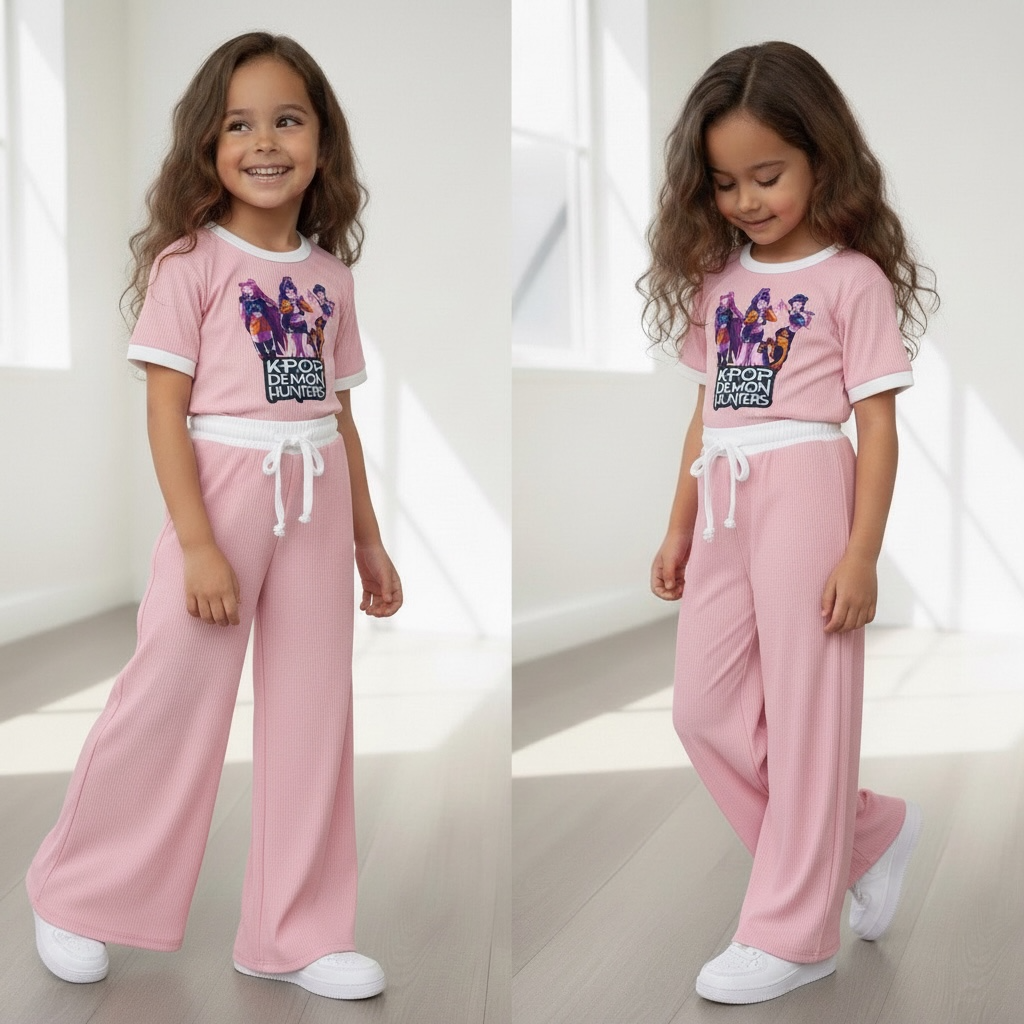 Fan van K-pop én de Netflix film KPop Demon Hunters? Dan is dit roze meisjes setje precies wat je zoekt! De outfit bestaat uit een T-Shirt met Huntr/x print (Rumi, Mira & Zoey) en een flared jogger.