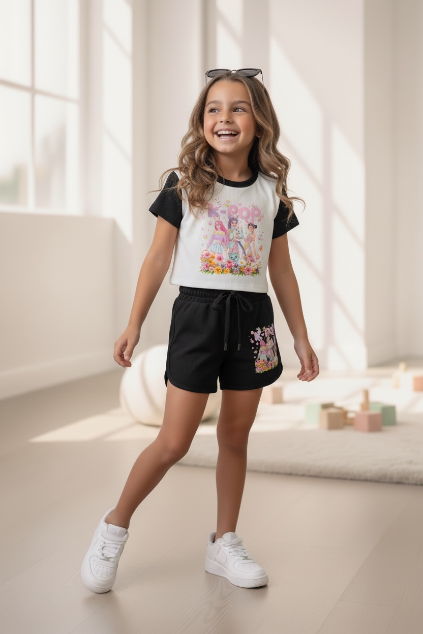 Fan van K-pop én de Netflix film KPop Demon Hunters? Dan is dit meisjes setje precies wat je zoekt! De outfit bestaat uit een T-Shirt met Huntr/x print (Rumi, Mira & Zoey) en een bijpassende broekje