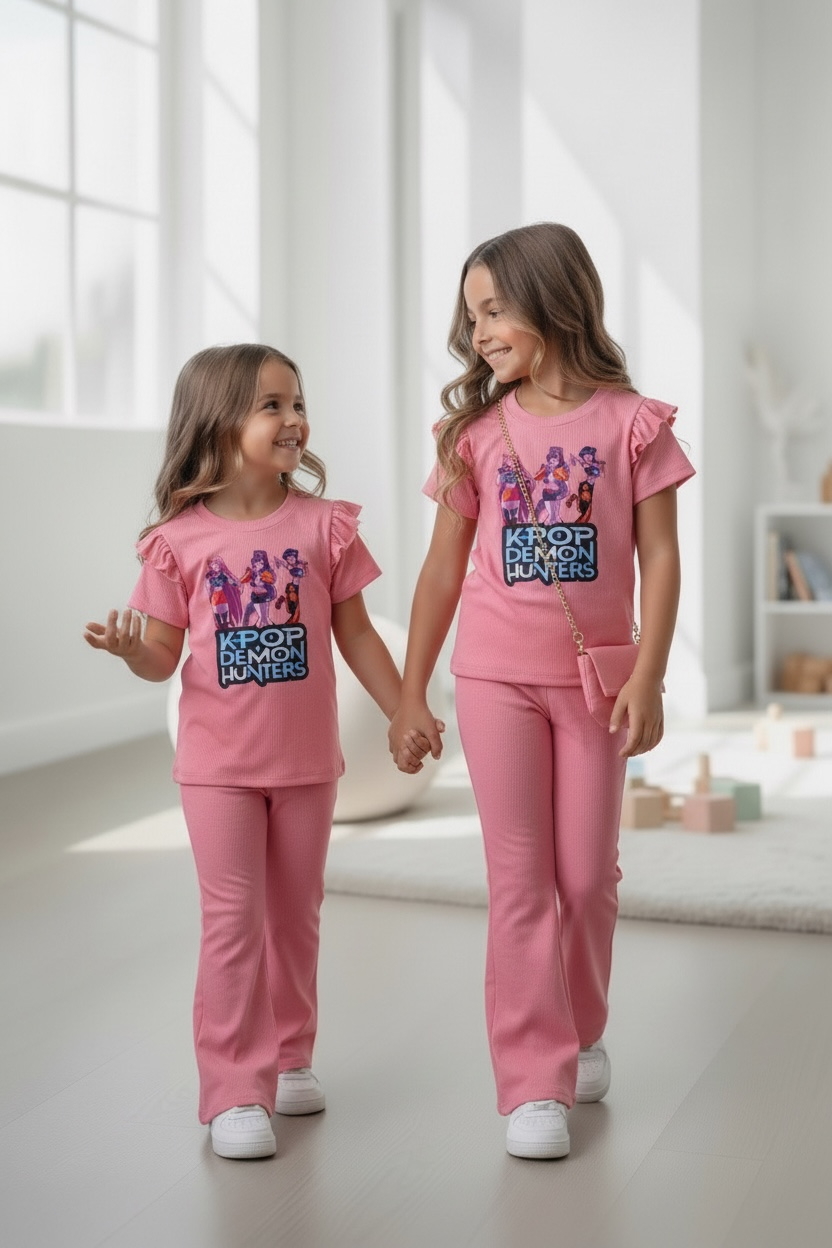 Fan van K-pop én de Netflix film KPop Demon Hunters? Dan is dit roze meisjes setje precies wat je zoekt! De outfit bestaat uit een T-Shirt met Huntr/x print (Rumi, Mira & Zoey) en een flared legging met bijpassend tasje.