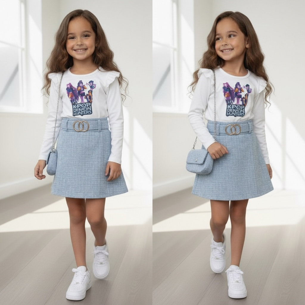 Het design sluit perfect aan bij de K-pop fashion trend: blauw, stijlvol en edgy – geïnspireerd op girlbands als Blackpink en de populaire karakters uit de film. Ideaal voor meisjes die graag een unieke en trendy K-pop look dragen.