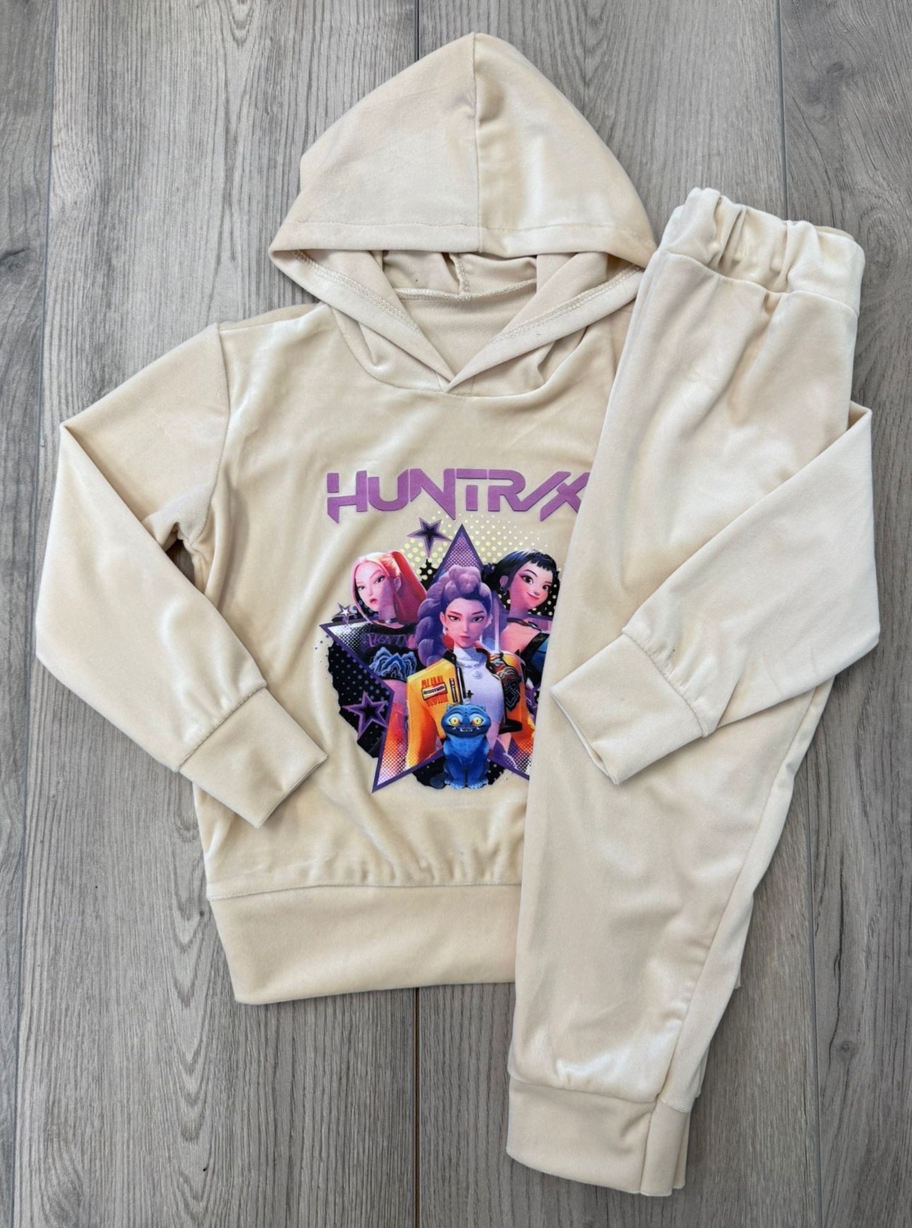 Fan van K-pop én de Netflix film KPop Demon Hunters? Dan is dit beige meisjes setje precies wat je zoekt! De outfit bestaat uit een comfy sweater met Huntr/x print (Rumi, Mira & Zoey) en een bijpassende velvet jogger.