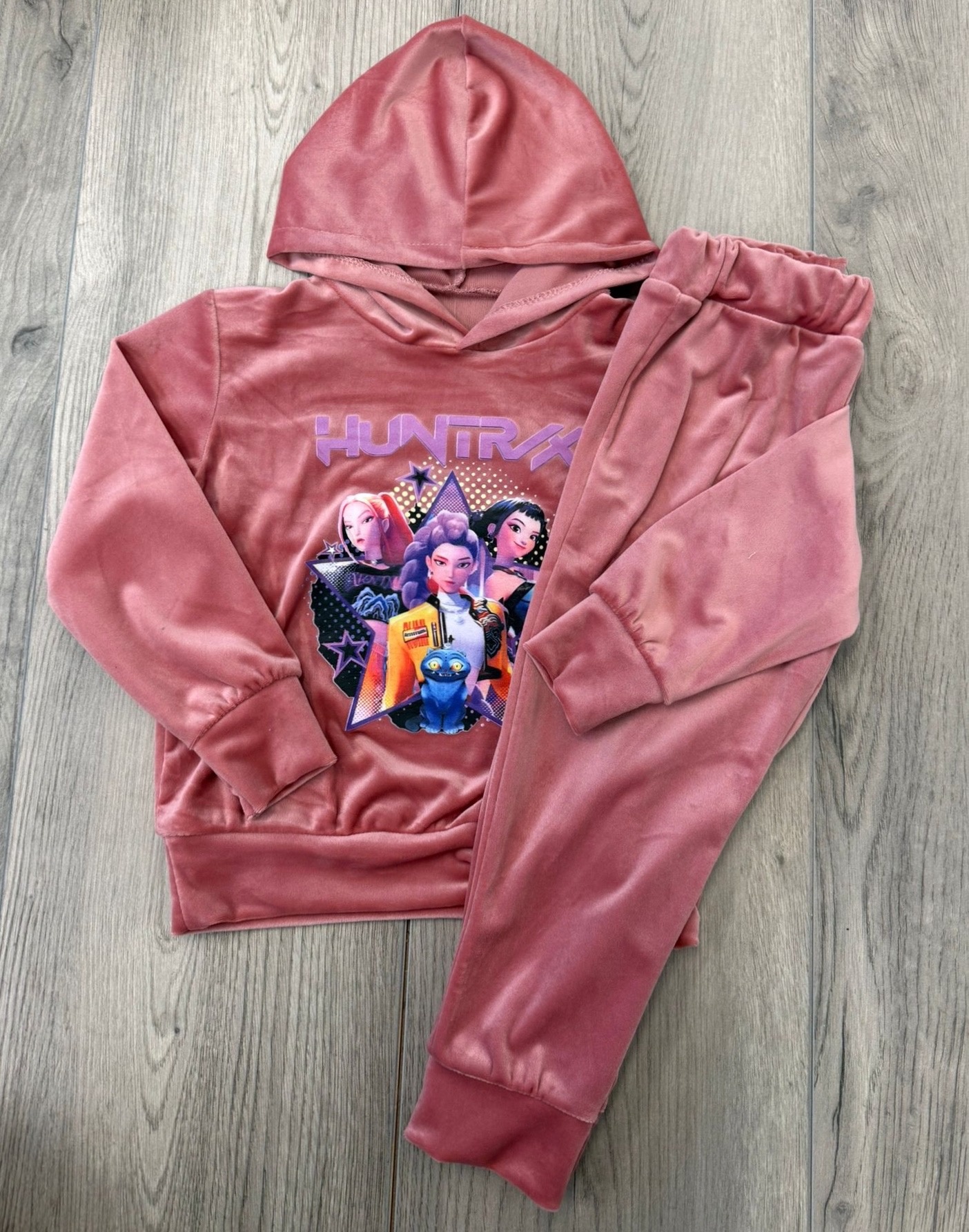 Fan van K-pop én de Netflix film KPop Demon Hunters? Dan is dit roze meisjes setje precies wat je zoekt! De outfit bestaat uit een comfy sweater met Huntr/x print (Rumi, Mira & Zoey) en een bijpassende velvet jogger.