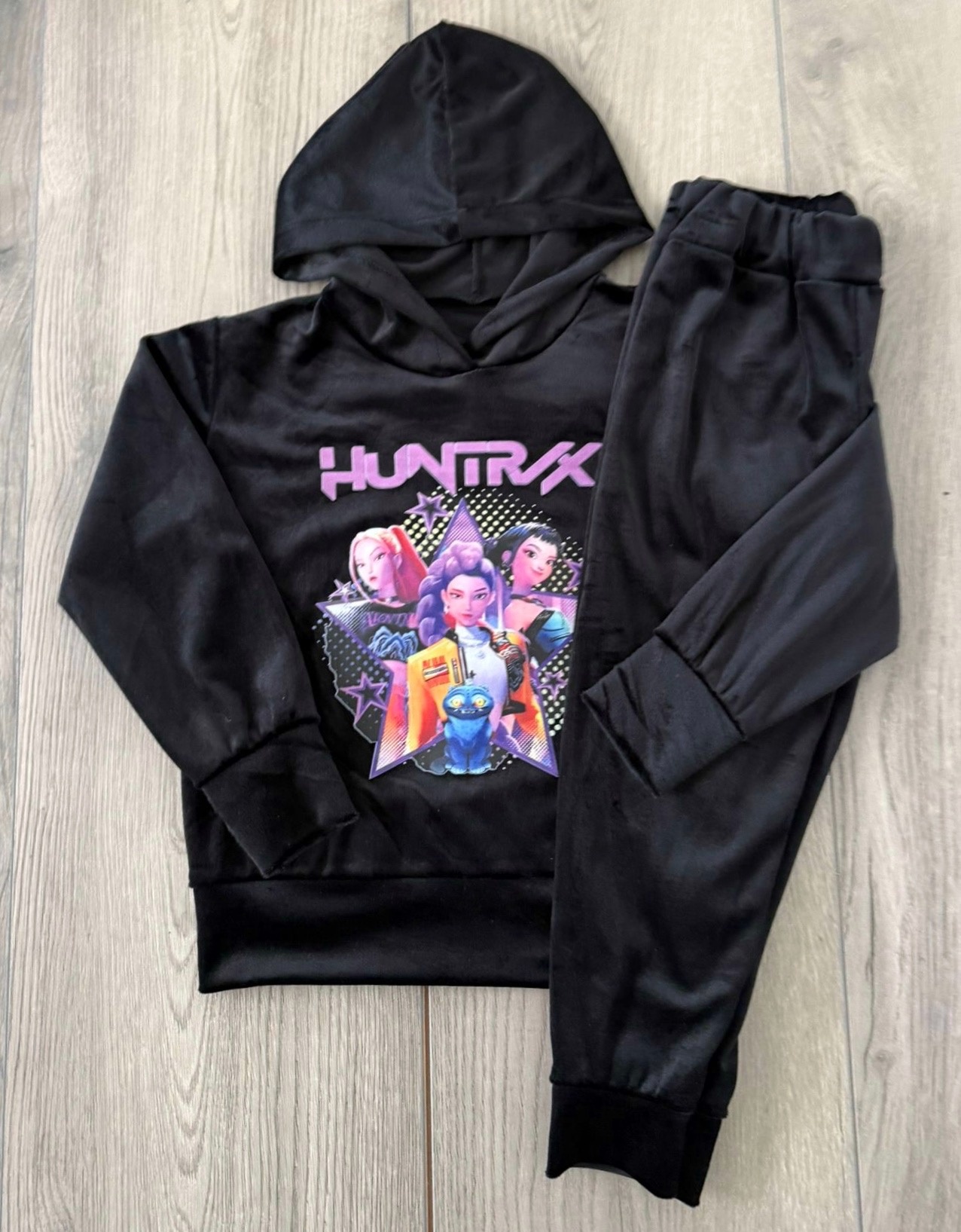 Fan van K-pop én de Netflix film KPop Demon Hunters? Dan is dit zwarte meisjes setje precies wat je zoekt! De outfit bestaat uit een comfy sweater met Huntr/x print (Rumi, Mira & Zoey) en een bijpassende velvet jogger.