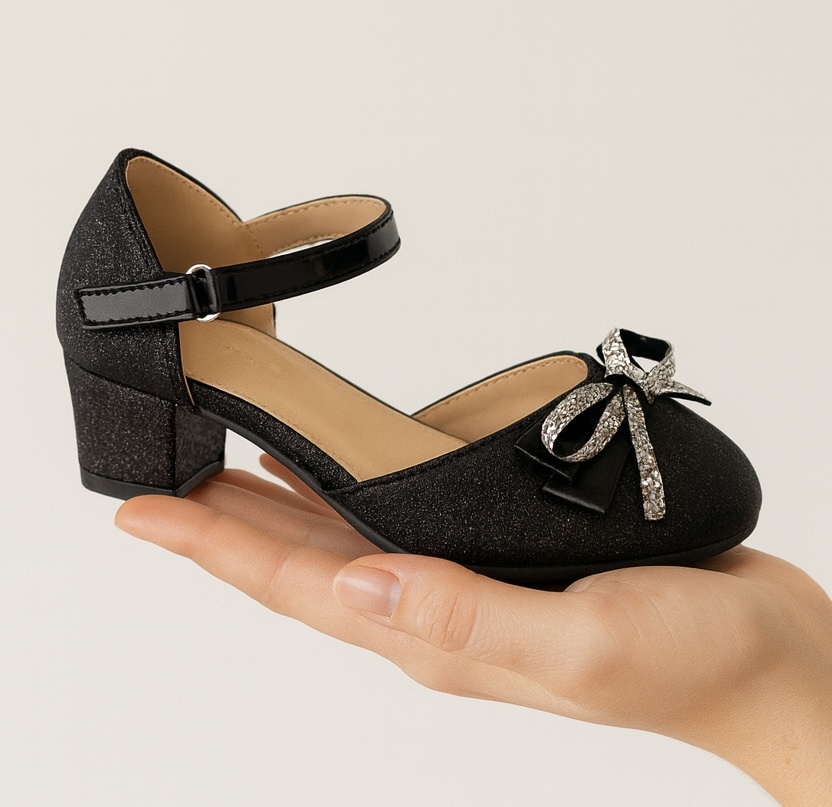 Chique kinderhakken in het zwart met glitterstrik. Perfect voor feestjes, bruiloften of gewoon om te stralen! Verkrijgbaar in maat 25 t/m 36. Op werkdagen voor 15:00 besteld, is morgen in huis!