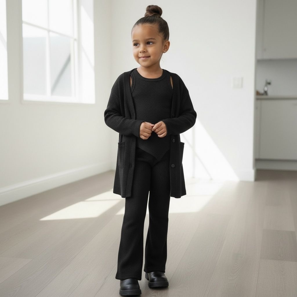 Hoe schattig is dit?! Dit zwarte kleurige meisjes setje met lange vest top en wijde broekspijpen is dé eyecatcher van dit seizoen. Gemaakt van zachte, rekbare stof voor ultiem comfort én stijl. Ideaal voor school, feestje of een dagje weg. Verkrijgbaar van maat 98/104 t/m 158/164. Combineer met sneakers voor een sportieve look of laarsjes voor extra flair!